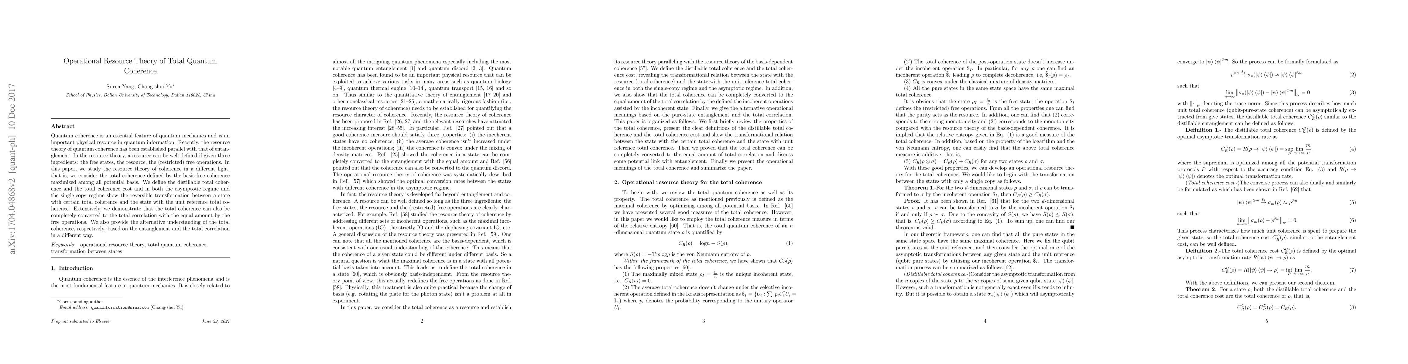 This paper explores the resource theory of total quantum coherence, defining distilable total coherence and total coherence cost. It demonstrates reversible transformations between states with different total coherence levels and shows that total coherence can be converted to total correlation via free operations.