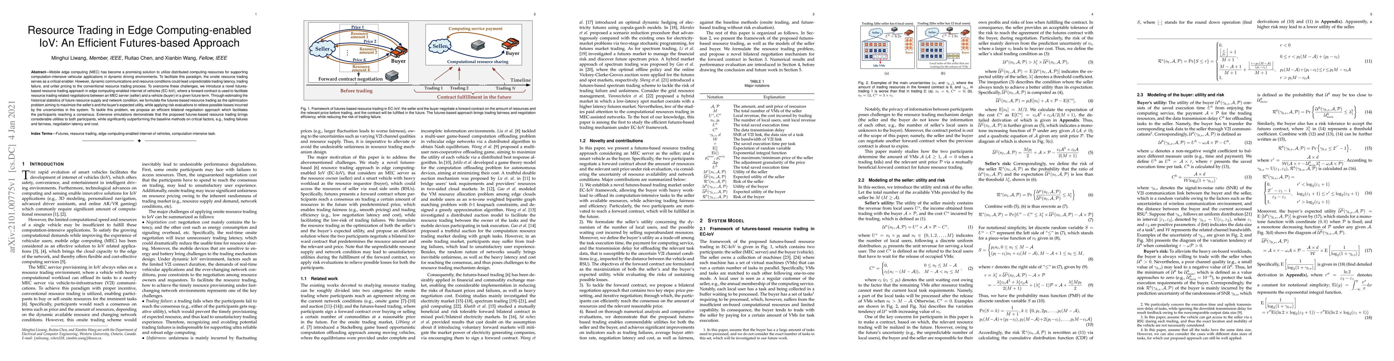 This paper proposes a futures-based resource trading approach in edge computing-enabled internet of vehicles (IoV) to address unpredictable trading latency and pricing issues. The method uses forward contracts to optimize negotiations between an MEC server and vehicles, achieving better performance in terms of trading failures, fairness, and negotiation efficiency.