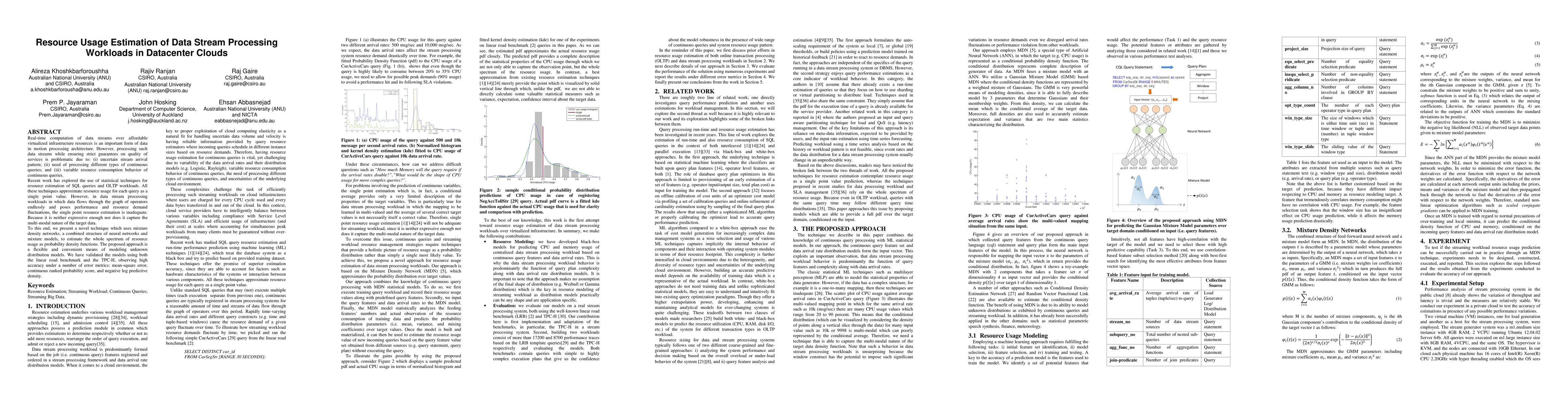 Real-time computation of data streams over affordable virtualized infrastructure resources is an important form of data in motion processing architecture. However, processing such data streams while ensuring strict guarantees on quality of services is problematic due to: (i) uncertain stream arrival pattern; (ii) need of processing different types of continuous queries; and (iii) variable resource consumption behavior of continuous queries. Recent work has explored the use of statistical techniques for resource estimation of SQL queries and OLTP workloads. All these techniques approximate resource usage for each query as a single point value. However, in data stream processing workloads in which data flows through the graph of operators endlessly and poses performance and resource demand fluctuations, the single point resource estimation is inadequate. Because it is neither expressive enough nor does it capture the multi-modal nature of the target data. To this end, we present a novel technique which uses mixture density networks, a combined structure of neural networks and mixture models, to estimate the whole spectrum of resource usage as probability density functions. The proposed approach is a flexible and convenient means of modeling unknown distribution models. We have validated the models using both the linear road benchmark and the TPC-H, observing high accuracy under a number of error metrics: mean-square error, continuous ranked probability score, and negative log predictive density.