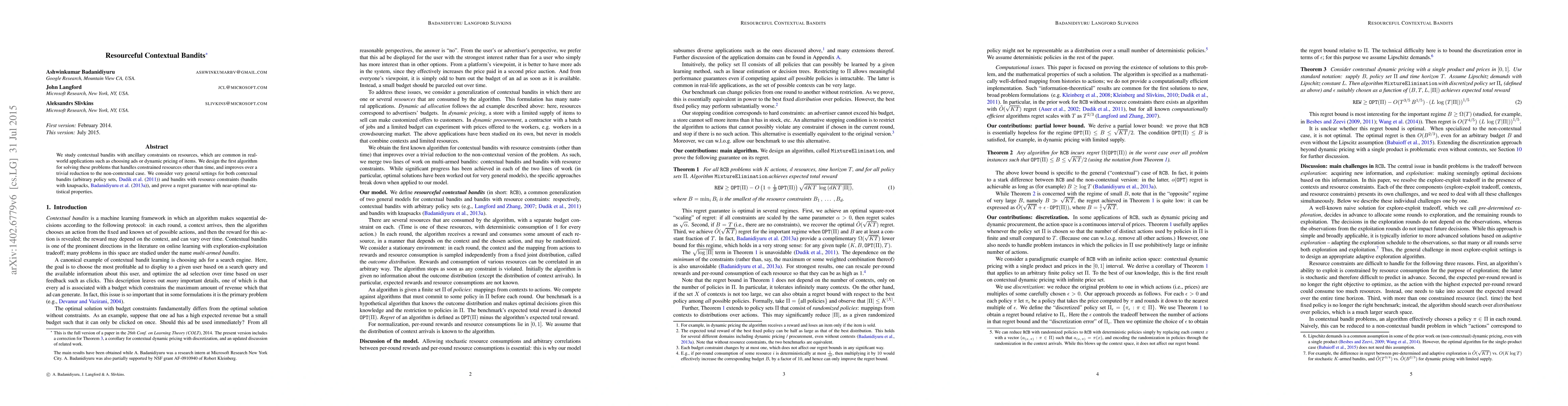 This paper introduces an algorithm for contextual bandits with resource constraints, improving upon non-contextual approaches. It achieves near-optimal regret guarantees in settings with general policy sets and resource constraints, such as knapsack problems.