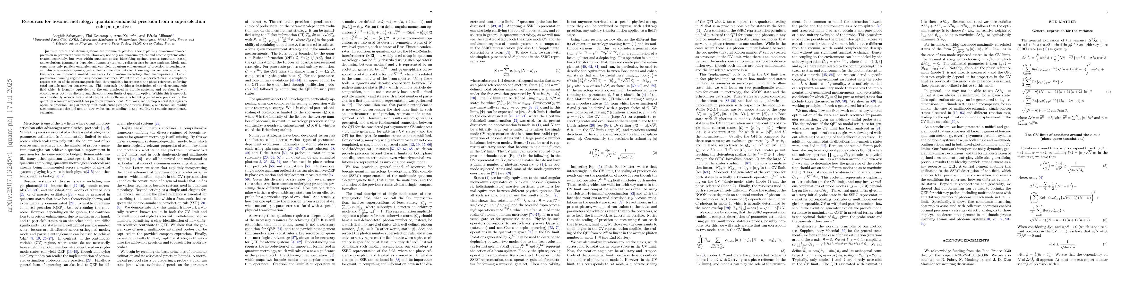 Quantum optics and atomic systems are prominent platforms for exploiting quantum-enhanced precision in parameter estimation. However, not only are quantum optical and atomic systems often treated separately, but even within quantum optics, identifying optimal probes (quantum states) and evolutions (parameter-dependent dynamics) typically relies on case-by-case analyses. Mode, and sometimes only particle entanglement, can yield quantum enhancement of precision in continuous- and discrete-variable regimes, yet a clear connection between these regimes remains elusive. In this work, we present a unified framework for quantum metrology that encompasses all known precision-enhancing regimes using bosonic resources. We introduce a superselection rule compliant representation of the electromagnetic field that explicitly incorporates the phase reference, enforcing total particle number conservation. This approach provides a description of the electromagnetic field which is formally equivalent to the one employed in atomic systems, and we show how it encompasses both the discrete and the continuous limits of quantum optics. Within this framework, we consistently recover established results while offering a coherent physical interpretation of the quantum resources responsible for precision enhancement. Moreover, we develop general strategies to optimize precision using arbitrary multimode entangled probe states. Finally, our formalism readily accommodates noise, measurement strategies and non-unitary evolutions, extending its applicability to realistic experimental scenarios.