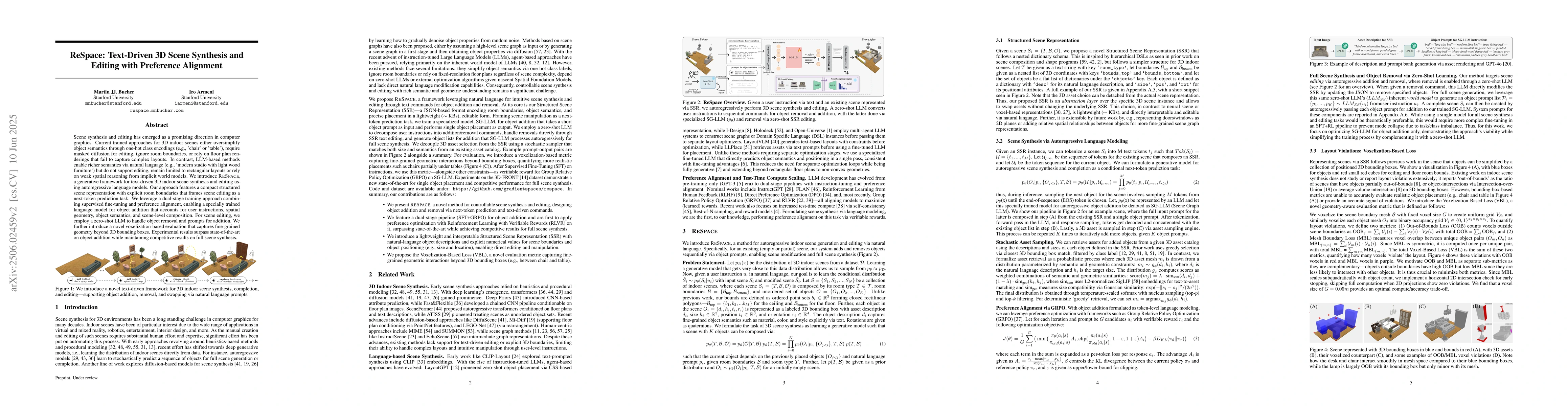 ReSpace introduces a novel text-driven 3D scene synthesis and editing framework using autoregressive language models with a structured scene representation and dual-stage training approach.