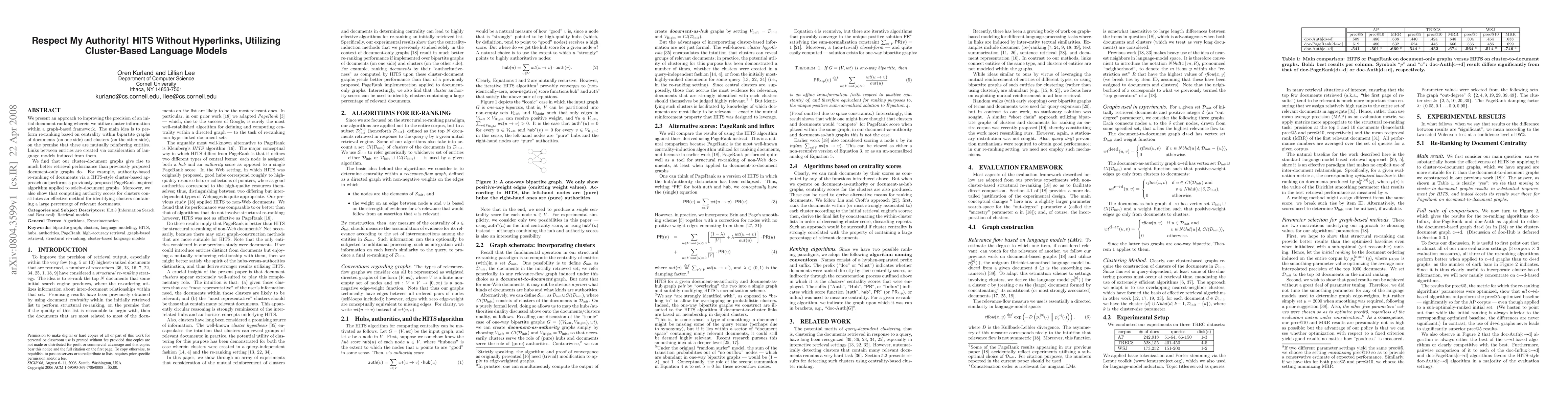 This paper proposes a cluster-based language model to improve document ranking precision using HITS without hyperlinks. It leverages cluster information within bipartite graphs, showing superior retrieval performance compared to document-only graphs, and demonstrates that authority-based re-ranking via cluster-document graphs outperforms traditional PageRank-based methods.