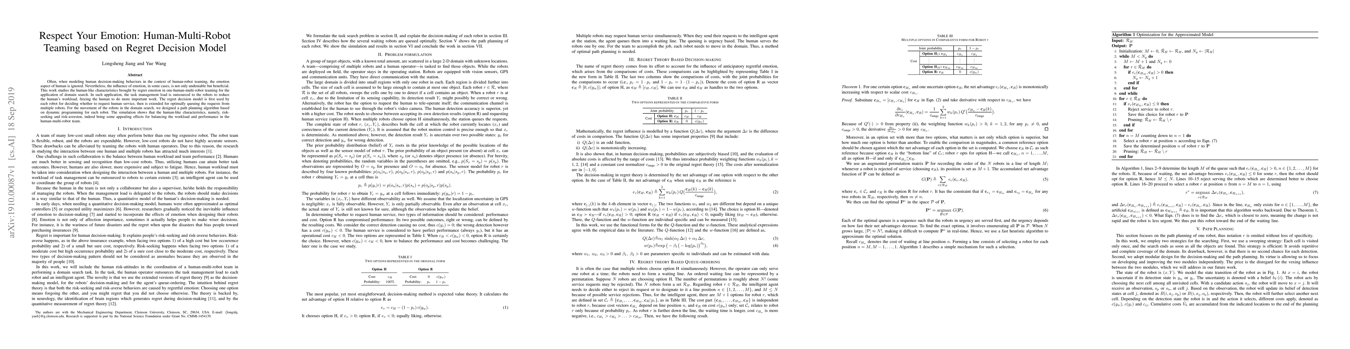 This paper explores human-robot teaming by incorporating regret emotion into decision-making, showing that it can optimize task management and balance workload. A regret decision model guides robots in requesting human assistance, and a dynamic programming-based path planning algorithm enhances robot movement efficiency.
