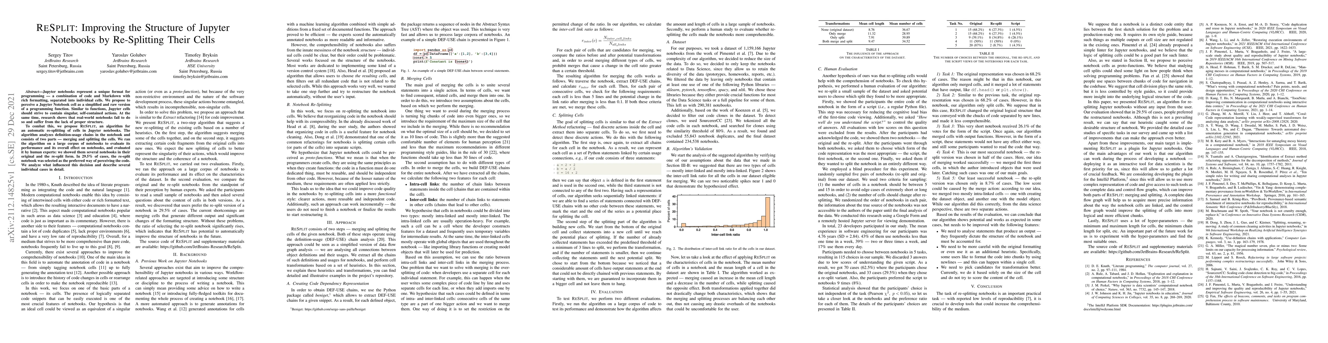 ReSplit is an algorithm designed to improve the structure of Jupyter Notebooks by automatically re-splitting cells to enhance their self-contained nature, akin to programming functions. The algorithm's effectiveness was evaluated by human experts, who preferred the re-split notebooks in 29.5% of cases, indicating its potential to improve notebook organization.