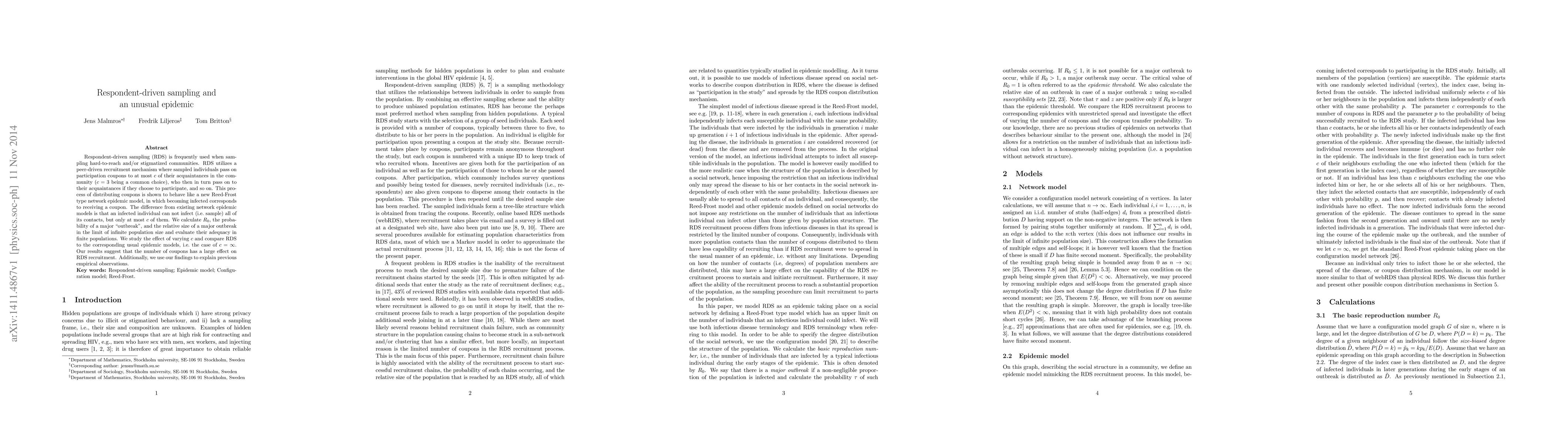This paper explores respondent-driven sampling (RDS) as a peer-driven recruitment method for hard-to-reach communities, modeling it as a modified Reed-Frost epidemic model where individuals can recruit at most $c$ acquaintances. The study calculates the probability of major recruitment "outbreaks" and assesses RDS's effectiveness in finite populations, finding that the number of coupons significantly influences recruitment success.