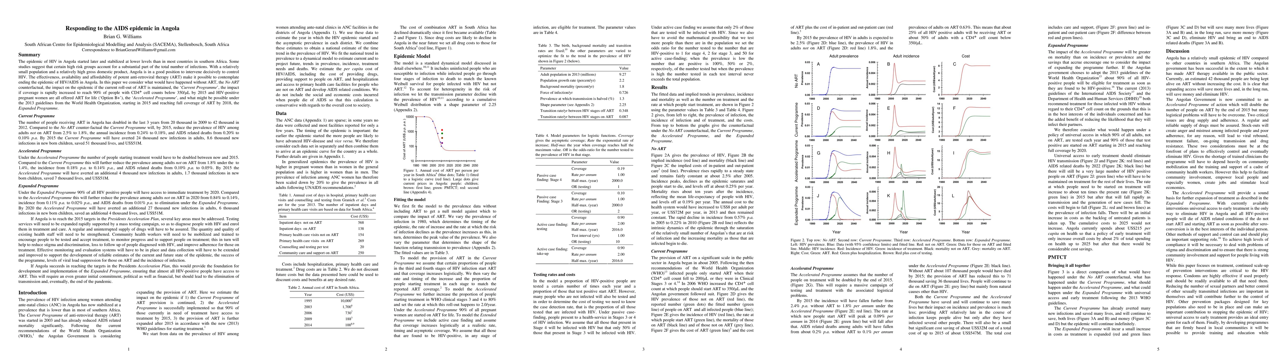 The epidemic of HIV in Angola started later and stabilized at lower levels than elsewhere in southern Africa. With a relatively small population and a high GDP, Angola is in a good position to intervene decisively to control HIV. The effectiveness, availability and affordability of anti-retroviral therapy (ART) make it possible to contemplate ending the epidemic of HIV/AIDS in Angola. We consider what would have happened without ART, the No ART counterfactual, the impact on the epidemic if the current roll-out of ART is maintained, the Current Programme, the impact if coverage is rapidly increased to reach 90% of people with CD4+ cell counts below 350/micro-litre by 2015 and HIV-positive pregnant women are all offered ART for life (Option B+), the Accelerated Programme, and what might be possible under the 2013 guidelines from the World Health Organization, starting in 2015 and reaching full coverage of ART by 2018, the Expanded Programme.If Angola is to reach the 2015 targets in the Presidents Acceleration Plan testing services will need to be expanded. A regular, uninterrupted supply of drugs will have to be assured. Existing health staff will need to be strengthened. Community health workers will need to be mobilized and trained to encourage people to be tested and accept treatment, to monitor progress and to support people on treatment; this in turn will help to reduce stigma and discrimination, loss to follow up of people diagnosed with HIV, and improve adherence for those on treatment. Effective monitoring and evaluation systems will have to be in place and data collection will have to be extended and improved to support the development of reliable estimates of the current and future state of the epidemic, the success of the programme, levels of viral load suppression for those on ART and the incidence of infection.