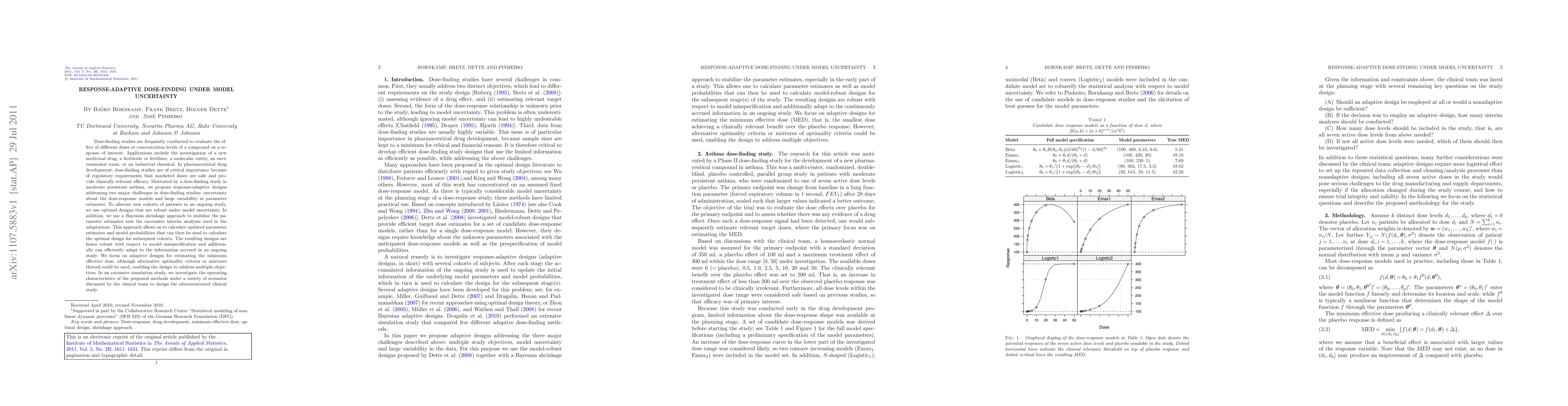 This paper proposes response-adaptive designs for dose-finding studies that address model uncertainty and parameter variability. It utilizes robust optimal designs and Bayesian shrinkage to adapt to new data, ensuring safety and efficacy in drug development.