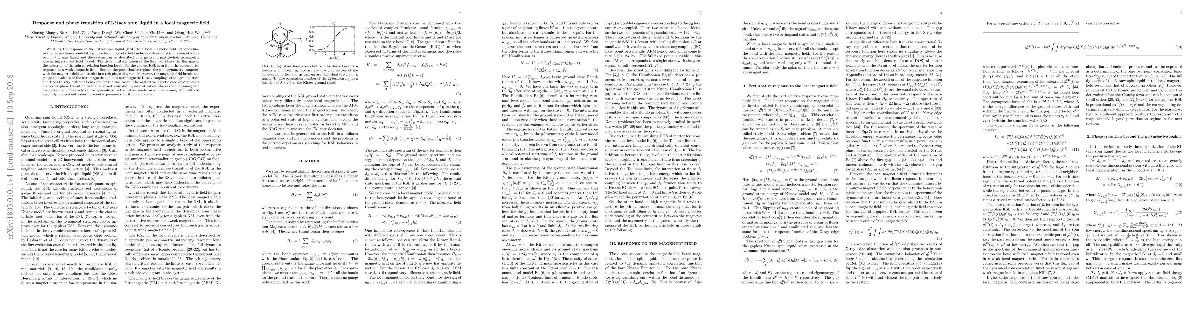 This paper investigates the response of a Kitaev spin liquid to a local magnetic field, revealing a dynamical excitation of a flux pair that closes the flux gap locally. It explores the competition between particle-hole asymmetry and the magnetic field, leading to distinct phase transitions in ferromagnetic versus anti-ferromagnetic Kitaev couplings.