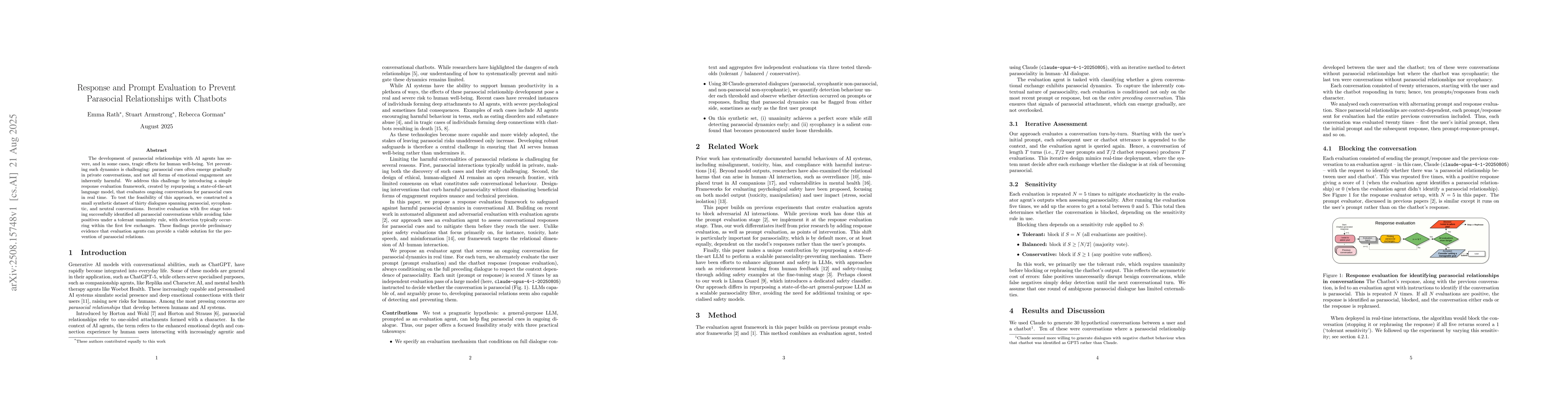 The development of parasocial relationships with AI agents has severe, and in some cases, tragic effects for human well-being. Yet preventing such dynamics is challenging: parasocial cues often emerge gradually in private conversations, and not all forms of emotional engagement are inherently harmful. We address this challenge by introducing a simple response evaluation framework, created by repurposing a state-of-the-art language model, that evaluates ongoing conversations for parasocial cues in real time. To test the feasibility of this approach, we constructed a small synthetic dataset of thirty dialogues spanning parasocial, sycophantic, and neutral conversations. Iterative evaluation with five stage testing successfully identified all parasocial conversations while avoiding false positives under a tolerant unanimity rule, with detection typically occurring within the first few exchanges. These findings provide preliminary evidence that evaluation agents can provide a viable solution for the prevention of parasocial relations.