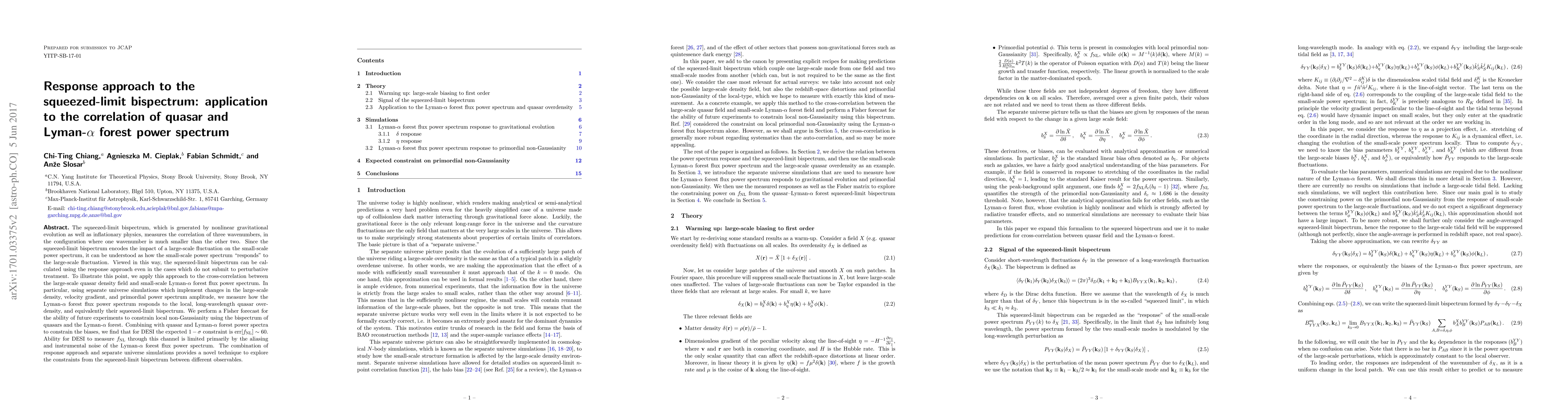 The squeezed-limit bispectrum, which is generated by nonlinear gravitational evolution as well as inflationary physics, measures the correlation of three wavenumbers, in the configuration where one wavenumber is much smaller than the other two. Since the squeezed-limit bispectrum encodes the impact of a large-scale fluctuation on the small-scale power spectrum, it can be understood as how the small-scale power spectrum "responds" to the large-scale fluctuation. Viewed in this way, the squeezed-limit bispectrum can be calculated using the response approach even in the cases which do not submit to perturbative treatment. To illustrate this point, we apply this approach to the cross-correlation between the large-scale quasar density field and small-scale Lyman-$\alpha$ forest flux power spectrum. In particular, using separate universe simulations which implement changes in the large-scale density, velocity gradient, and primordial power spectrum amplitude, we measure how the Lyman-$\alpha$ forest flux power spectrum responds to the local, long-wavelength quasar overdensity, and equivalently their squeezed-limit bispectrum. We perform a Fisher forecast for the ability of future experiments to constrain local non-Gaussianity using the bispectrum of quasars and the Lyman-$\alpha$ forest. Combining with quasar and Lyman-$\alpha$ forest power spectra to constrain the biases, we find that for DESI the expected $1-\sigma$ constraint is ${\rm err}[f_{\rm NL}]\sim60$. Ability for DESI to measure $f_{\rm NL}$ through this channel is limited primarily by the aliasing and instrumental noise of the Lyman-$\alpha$ forest flux power spectrum. The combination of response approach and separate universe simulations provides a novel technique to explore the constraints from the squeezed-limit bispectrum between different observables.