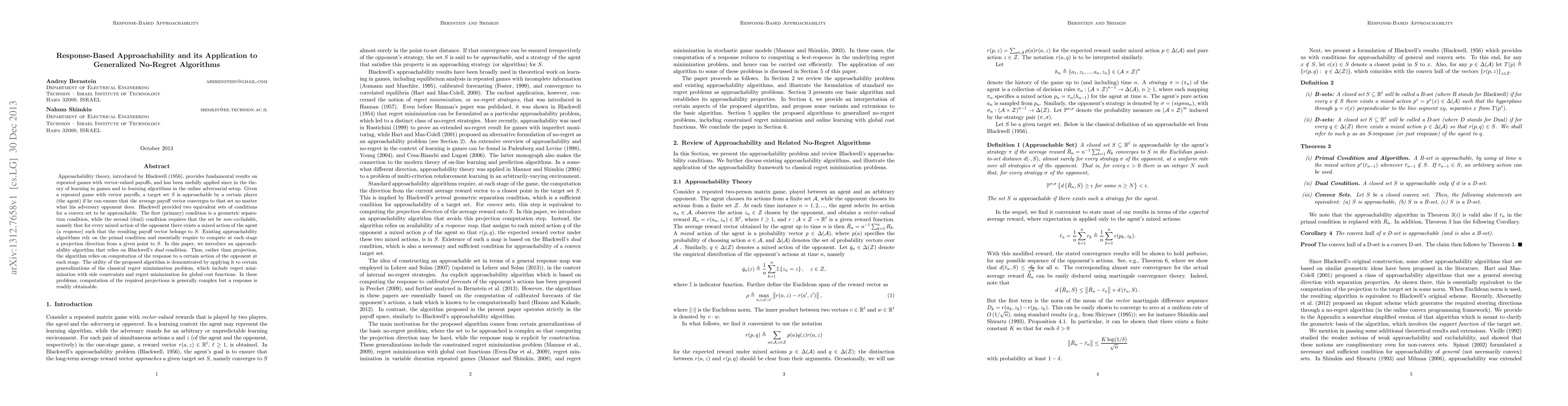 This paper introduces an approachability algorithm that relies on Blackwell's dual condition to ensure average payoff convergence in repeated games, offering a more efficient alternative to existing algorithms for regret minimization problems with side constraints or global cost functions.