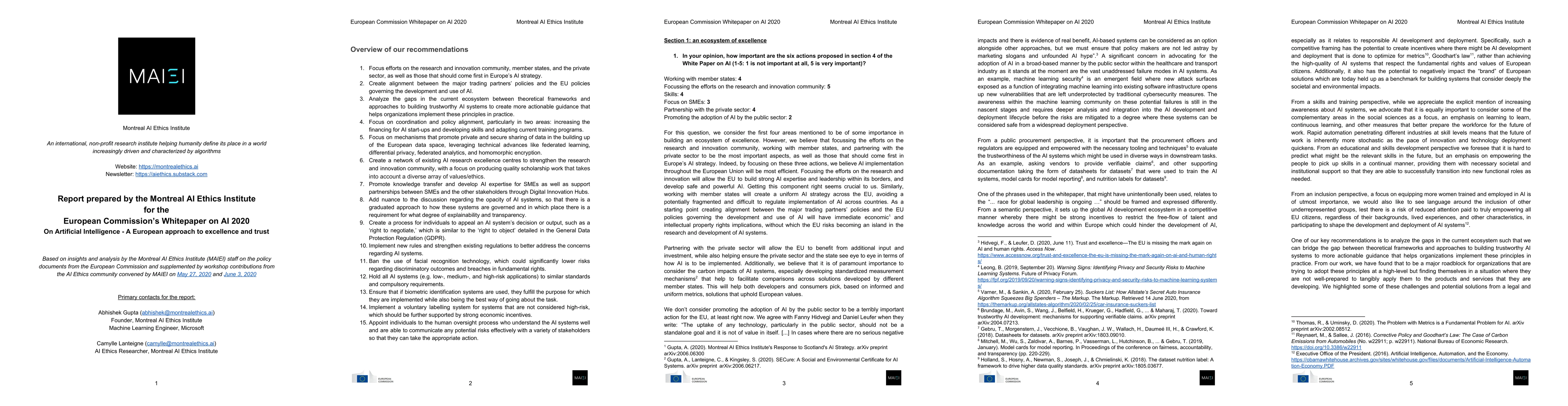 The Montreal AI Ethics Institute (MAIEI) reviewed the European Commission's AI white paper and proposed 15 recommendations to enhance the "ecosystem of excellence" and "ecosystem of trust," focusing on policy alignment, data sharing, and the ethical oversight of AI, IoT, and robotics. Key suggestions include banning facial recognition and ensuring robust standards for AI systems.