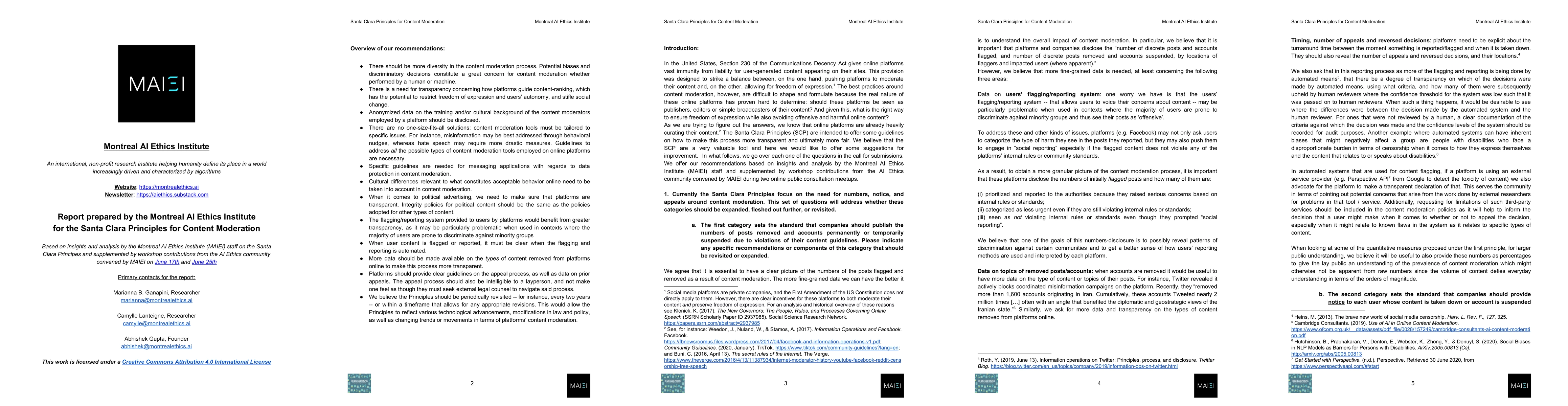 The Montreal AI Ethics Institute (MAIEI) responded to the EFF's call for expanding the Santa Clara Principles, proposing 12 recommendations to enhance transparency and accountability in online content moderation, including increased diversity, transparency in data protection, and periodic updates to the guidelines.