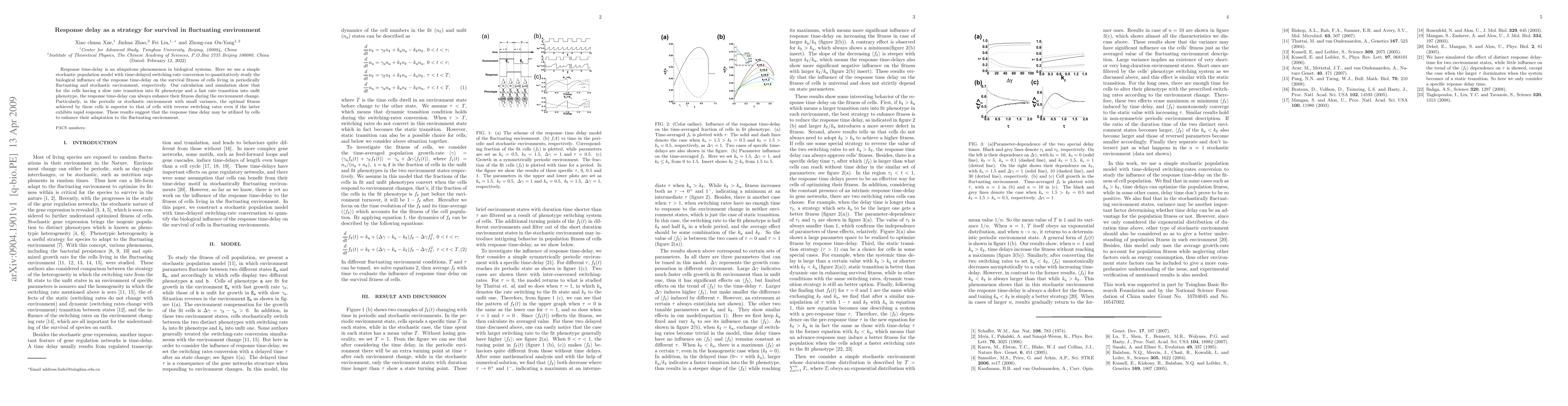 Response time-delay is an ubiquitous phenomenon in biological systems. Here we use a simple stochastic population model with time-delayed switching-rate conversion to quantitatively study the biological influence of the response time-delay on the survival fitness of cells living in periodically fluctuating and stochastic environment, respectively. Our calculation and simulation show that for the cells having a slow rate transition into fit phenotype and a fast rate transition into unfit phenotype, the response time-delay can always enhance their fitness during the environment change. Particularly, in the periodic or stochastic environment with small variance, the optimal fitness achieved by these cells is superior to that of cells with reverse switching rates even if the latter exhibits rapid response. These results suggest that the response time delay may be utilized by cells to enhance their adaptation to the fluctuating environment.