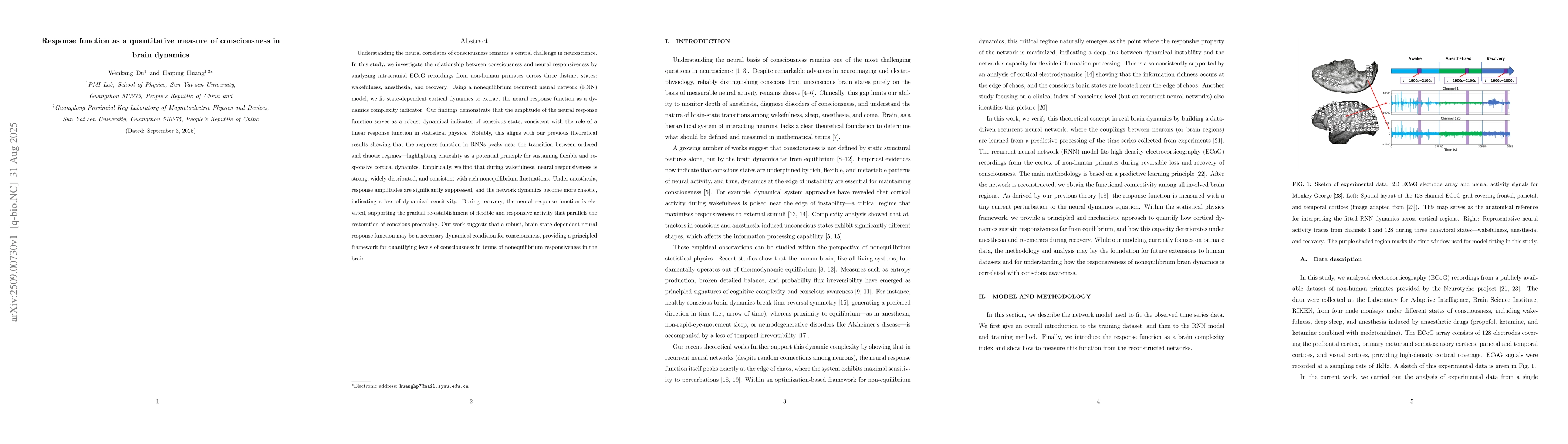 Understanding the neural correlates of consciousness remains a central challenge in neuroscience. In this study, we investigate the relationship between consciousness and neural responsiveness by analyzing intracranial ECoG recordings from non-human primates across three distinct states: wakefulness, anesthesia, and recovery. Using a nonequilibrium recurrent neural network (RNN) model, we fit state-dependent cortical dynamics to extract the neural response function as a dynamics complexity indicator. Our findings demonstrate that the amplitude of the neural response function serves as a robust dynamical indicator of conscious state, consistent with the role of a linear response function in statistical physics. Notably, this aligns with our previous theoretical results showing that the response function in RNNs peaks near the transition between ordered and chaotic regimes -- highlighting criticality as a potential principle for sustaining flexible and responsive cortical dynamics. Empirically, we find that during wakefulness, neural responsiveness is strong, widely distributed, and consistent with rich nonequilibrium fluctuations. Under anesthesia, response amplitudes are significantly suppressed, and the network dynamics become more chaotic, indicating a loss of dynamical sensitivity. During recovery, the neural response function is elevated, supporting the gradual re-establishment of flexible and responsive activity that parallels the restoration of conscious processing. Our work suggests that a robust, brain-state-dependent neural response function may be a necessary dynamical condition for consciousness, providing a principled framework for quantifying levels of consciousness in terms of nonequilibrium responsiveness in the brain.