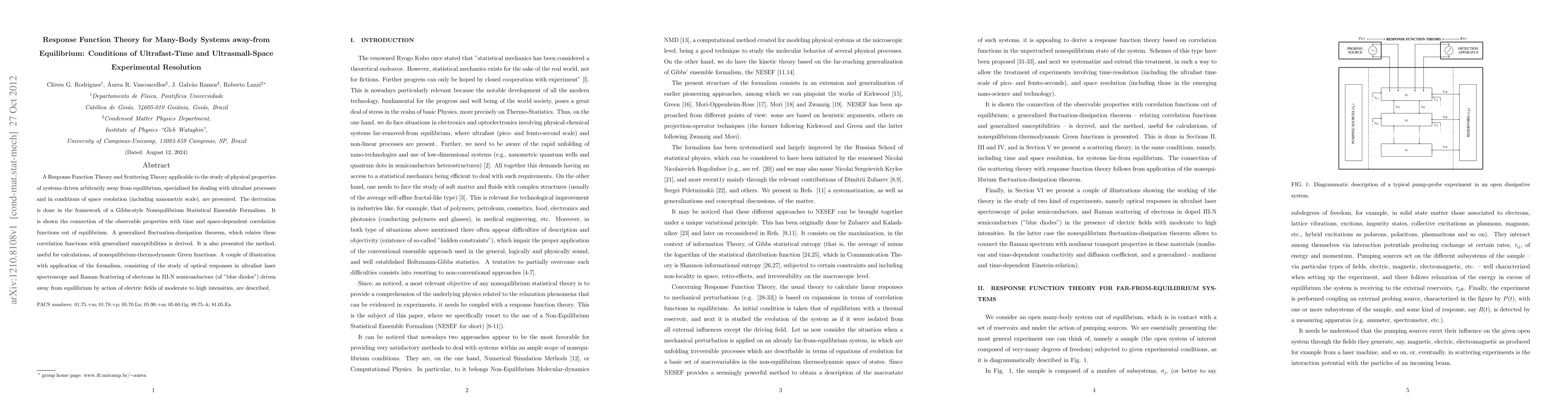A Response Function Theory and Scattering Theory applicable to the study of physical properties of systems driven arbitrarily away from equilibrium, specialized for dealing with ultrafast processes and in conditions of space resolution (including nanometric scale), are presented. The derivation is done in the framework of a Gibbs-style Nonequilibrium Statistical Ensemble Formalism. It is shown the connection of the observable properties with time and space-dependent correlation functions out of equilibrium. A generalized fluctuation-dissipation theorem, which relates these correlation functions with generalized susceptibilities is derived. It is also presented the method, useful for calculations, of nonequilibrium-thermodynamic Green functions. A couple of illustration with application of the formalism, consisting of the study of optical responses in ultrafast laser spectroscopy and Raman Scattering of electrons in III-N semiconductors (of "blue diodes") driven away from equilibrium by action of electric fields of moderate to high intensities, are described.