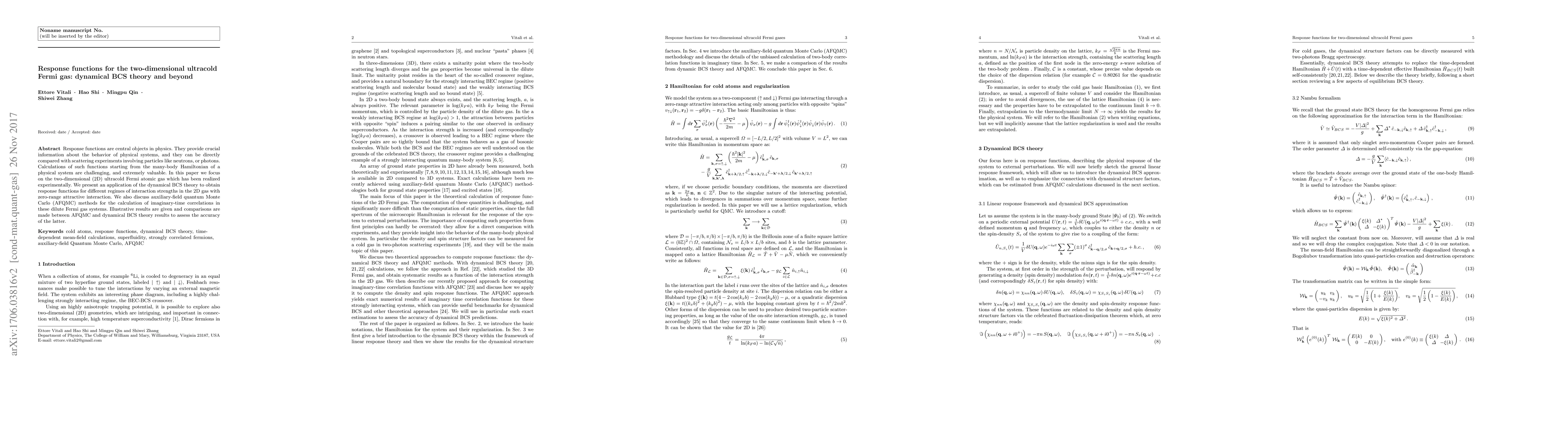 This paper explores response functions in a two-dimensional ultracold Fermi gas, applying dynamical BCS theory and comparing it with auxiliary-field quantum Monte Carlo (AFQMC) methods. It provides insights into the behavior of the gas under varying interaction strengths and assesses the accuracy of dynamical BCS theory against AFQMC calculations.