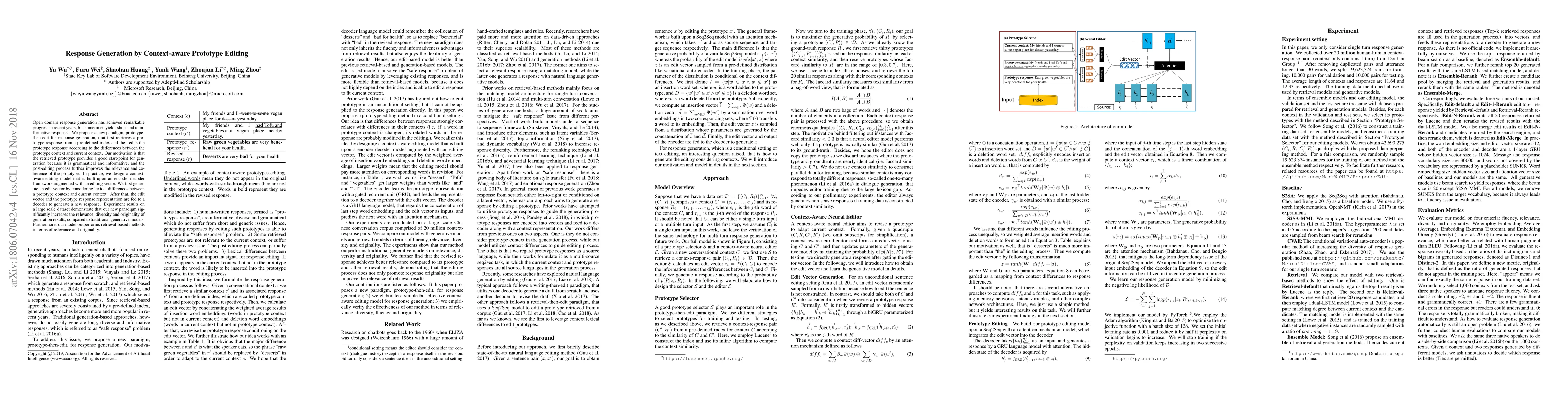 This paper proposes a novel context-aware prototype editing model for open domain response generation, which enhances response diversity and informativeness by revising existing response prototypes. Experimental results show that this approach outperforms generative and retrieval-based models on multiple metrics.