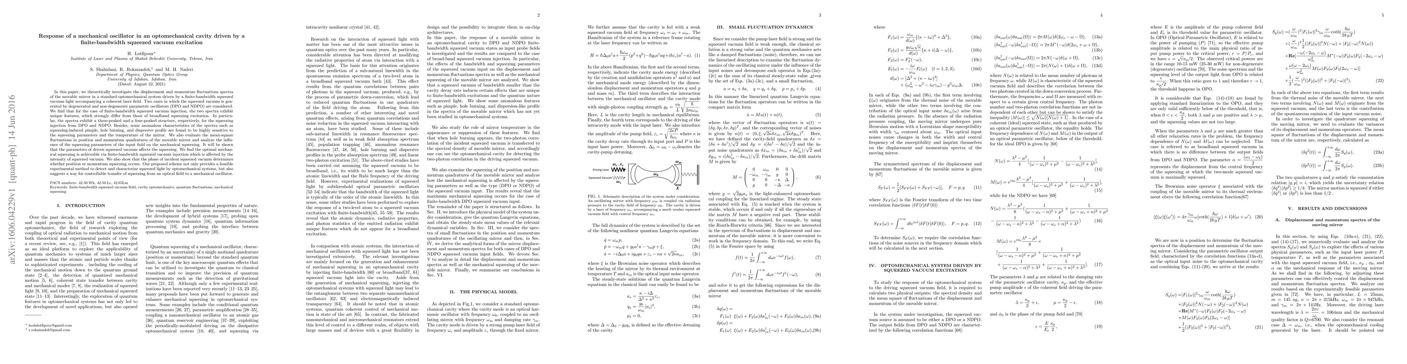This paper investigates the response of an optomechanical oscillator driven by finite bandwidth squeezed vacuum light, revealing unique three-peaked and four-peaked spectra for degenerated and non-degenerate parametric oscillators respectively. The study highlights the influence of squeezing parameters and temperature on mechanical squeezing, suggesting optimal conditions for controllable transfer of squeezing from optical to mechanical systems.