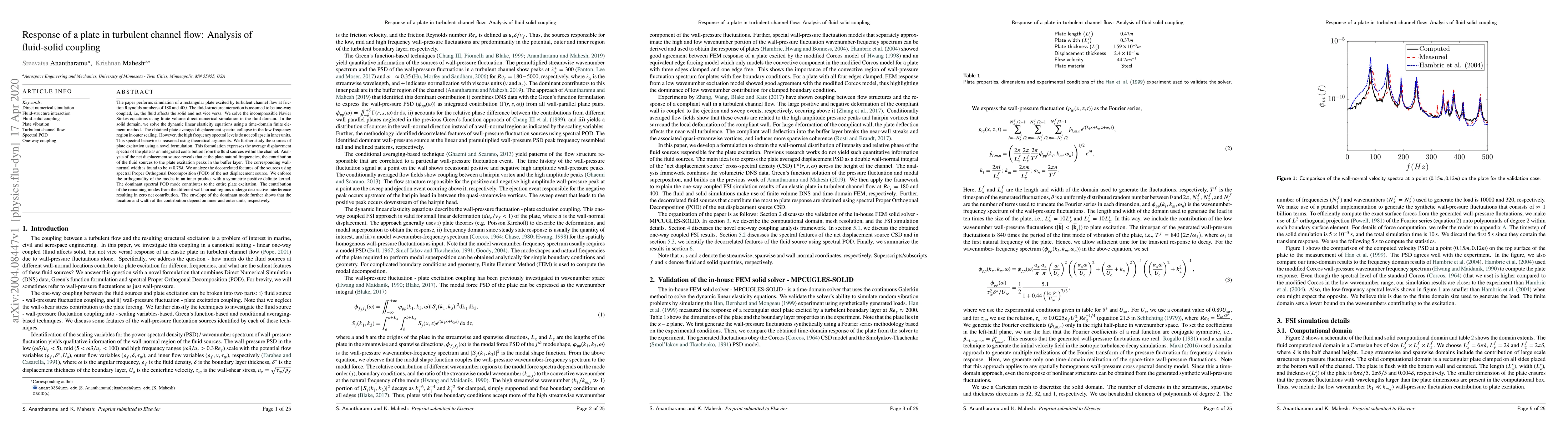A study on a plate in turbulent channel flow reveals that fluid-solid coupling causes non-collapsing spectral behavior at high frequencies, with the plate's natural frequencies exciting peak contributions from the fluid sources in the buffer layer.