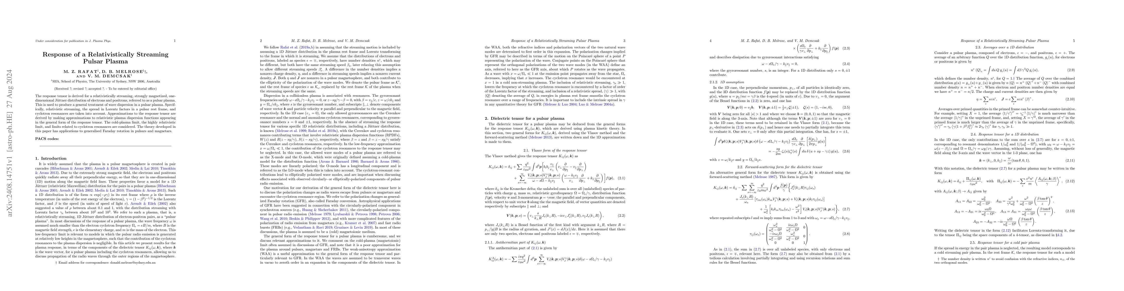 This paper derives the response tensor for relativistically streaming pulsar plasma, incorporating relativistic streaming, Lorentz factor spread, and cyclotron resonances, to study wave dispersion. It applies to generalized Faraday rotation in pulsars and magnetars.