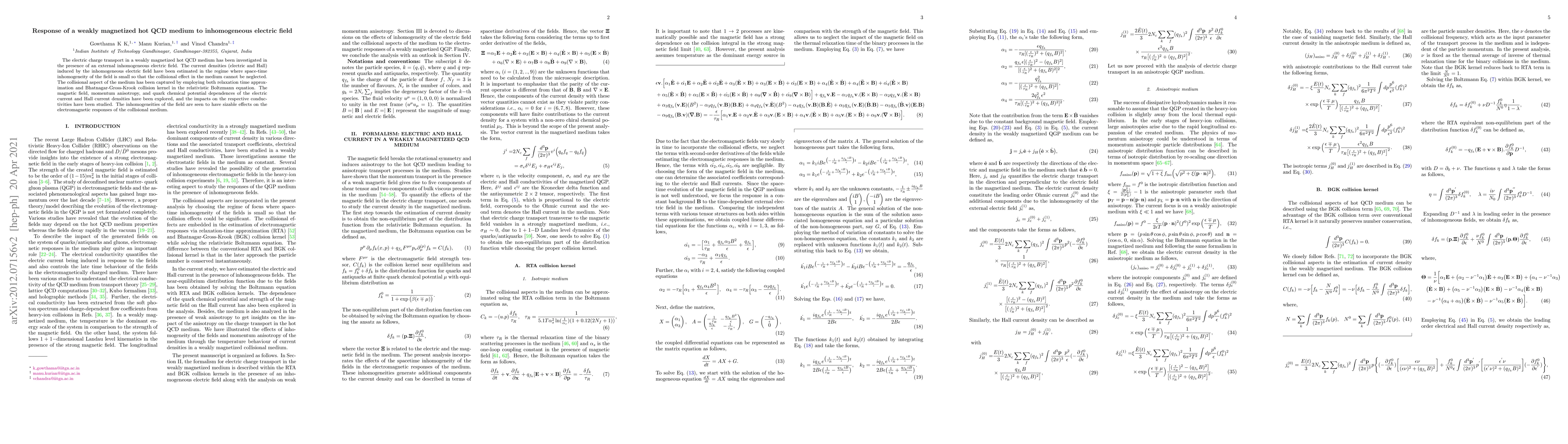 This paper investigates the electric charge transport in a weakly magnetized hot QCD medium under an inhomogeneous electric field, employing relativistic Boltzmann equations with collisional effects. It explores the dependencies on magnetic field, momentum anisotropy, and quark chemical potential, revealing significant impacts on electric and Hall current densities.