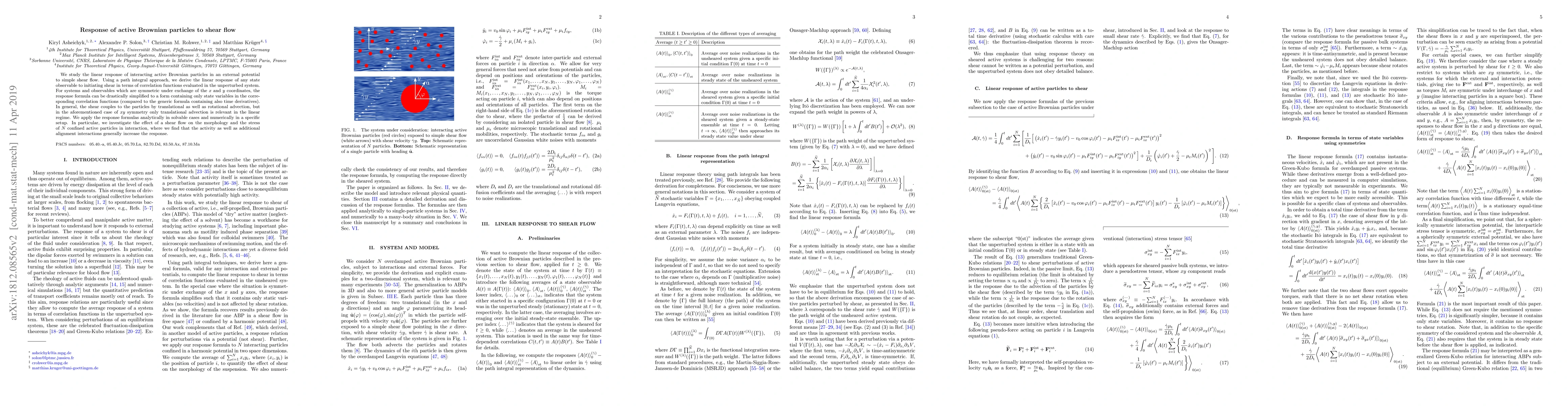 We study the linear response of interacting active Brownian particles in an external potential to simple shear flow. Using a path integral approach, we derive the linear response of any state observable to initiating shear in terms of correlation functions evaluated in the unperturbed system. For systems and observables which are symmetric under exchange of the $x$ and $y$ coordinates, the response formula can be drastically simplified to a form containing only state variables in the corresponding correlation functions (compared to the generic formula containing also time derivatives). In general, the shear couples to the particles by translational as well as rotational advection, but in the aforementioned case of $xy$ symmetry only translational advection is relevant in the linear regime. We apply the response formulas analytically in solvable cases and numerically in a specific setup. In particular, we investigate the effect of a shear flow on the morphology and the stress of $N$ confined active particles in interaction, where we find that the activity as well as additional alignment interactions generally increase the response.