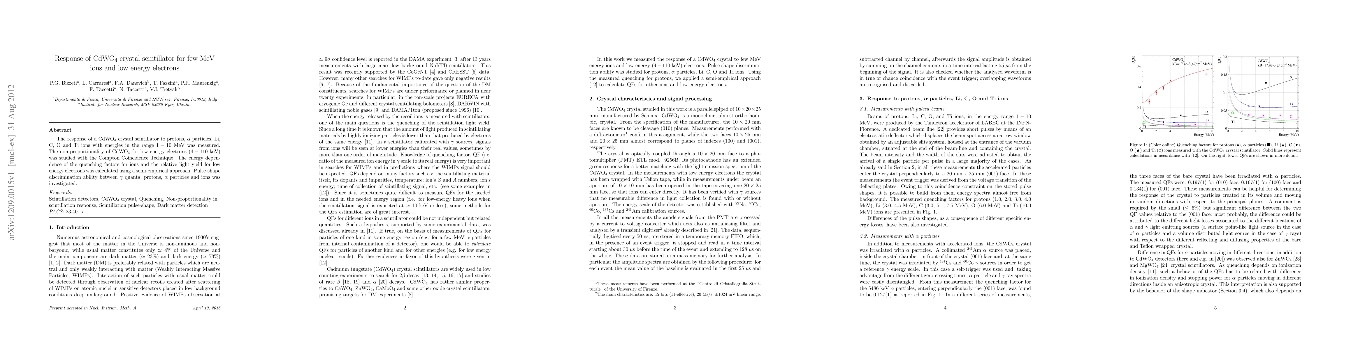 This study measures the response of CdWO4 crystal scintillator to various ions and low energy electrons, finding non-proportionality in electron detection and calculating energy dependence and quenching factors. The study also explores the scintillator's pulse-shape discrimination capabilities.