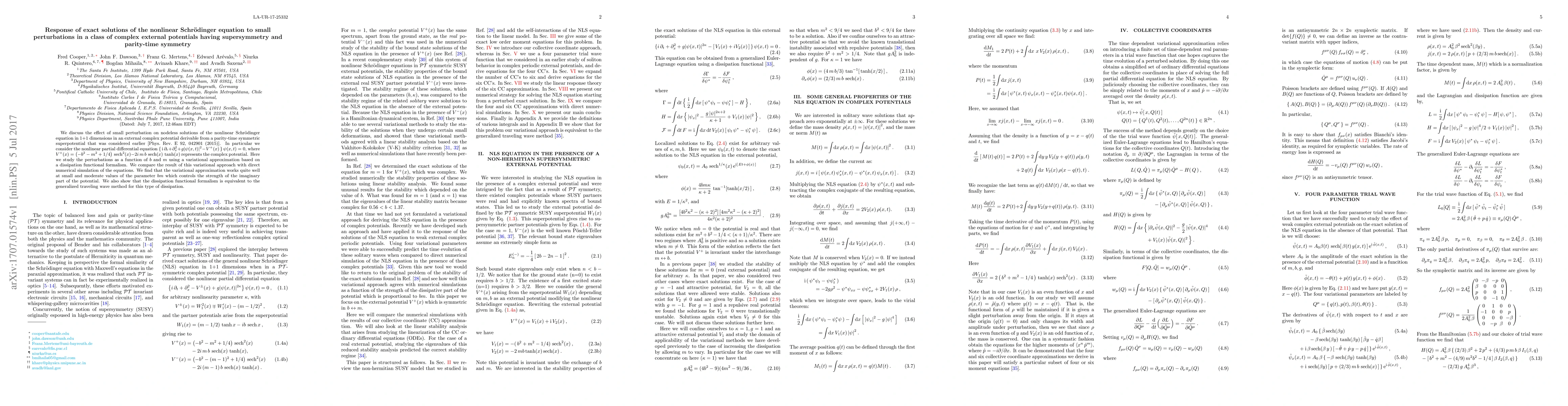 We discuss the effect of small perturbation on nodeless solutions of the nonlinear \Schrodinger\ equation in 1+1 dimensions in an external complex potential derivable from a parity-time symmetric superpotential that was considered earlier [Phys.~Rev.~E 92, 042901 (2015)]. In particular we consider the nonlinear partial differential equation $\{ \, \rmi \, \partial_t + \partial_x^2 + g |\psi(x,t)|^2 - V^{+}(x) \, \} \, \psi(x,t) = 0$, where $V^{+}(x) = \qty( -b^2 - m^2 + 1/4 ) \, \sech^2(x) - 2 i \, m \, b \, \sech(x) \, \tanh(x)$ represents the complex potential. Here we study the perturbations as a function of $b$ and $m$ using a variational approximation based on a dissipation functional formalism. We compare the result of this variational approach with direct numerical simulation of the equations. We find that the variational approximation works quite well at small and moderate values of the parameter $b m$ which controls the strength of the imaginary part of the potential. We also show that the dissipation functional formalism is equivalent to the generalized traveling wave method for this type of dissipation.