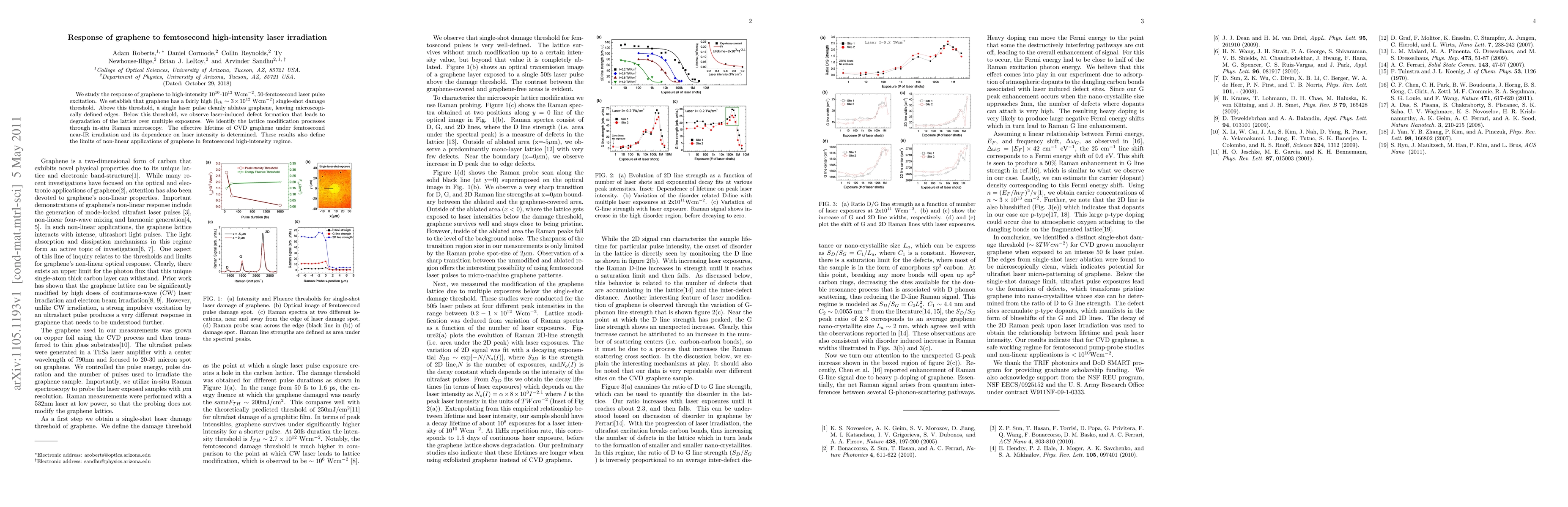 This paper investigates graphene's response to femtosecond high-intensity laser pulses, finding a damage threshold of ~3×10^12 Wcm^-2. Above this threshold, single pulses cleanly ablate graphene, while below it, repeated pulses cause lattice degradation observable via Raman microscopy.