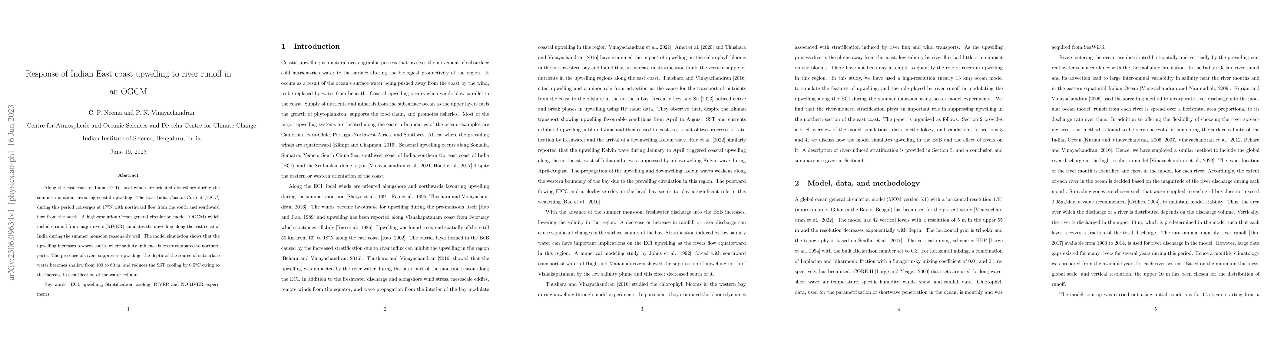 This study uses a high-resolution Ocean General Circulation Model to simulate upwelling along India's east coast during the summer monsoon, showing that river runoff reduces upwelling and SST cooling by increasing water column stratification. The upwelling intensity increases southward where salinity influence is weaker.