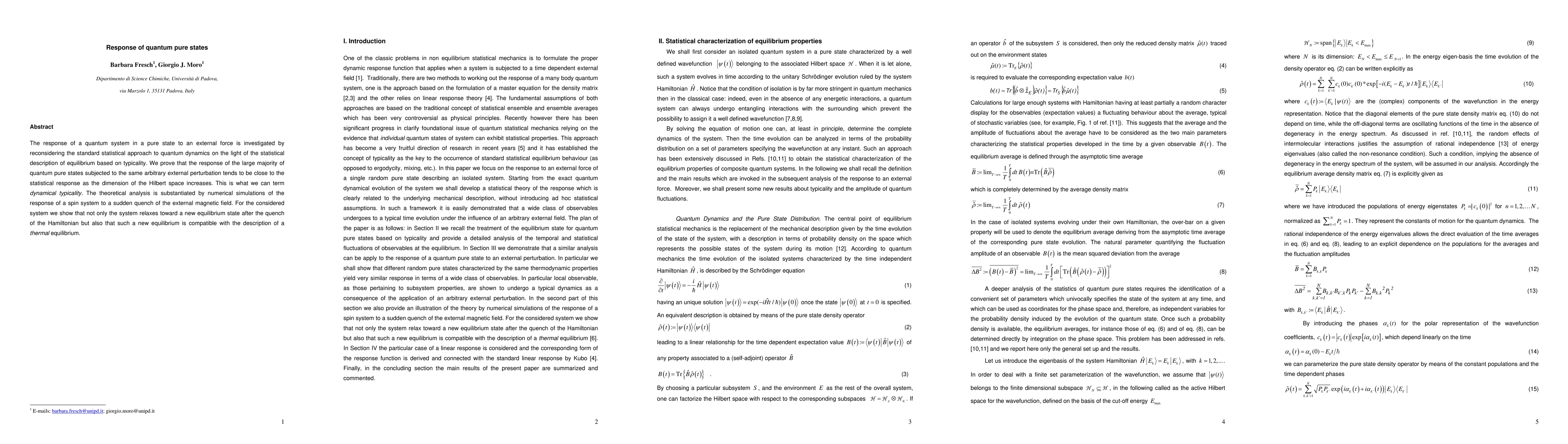 This paper investigates how quantum pure states respond to external forces, demonstrating that the majority of these states exhibit a response close to the statistical average as the system's dimension grows, a phenomenon termed dynamical typicality. Numerical simulations of a spin system under a sudden magnetic field quench confirm this behavior and show the system's relaxation towards a new thermal equilibrium state.
