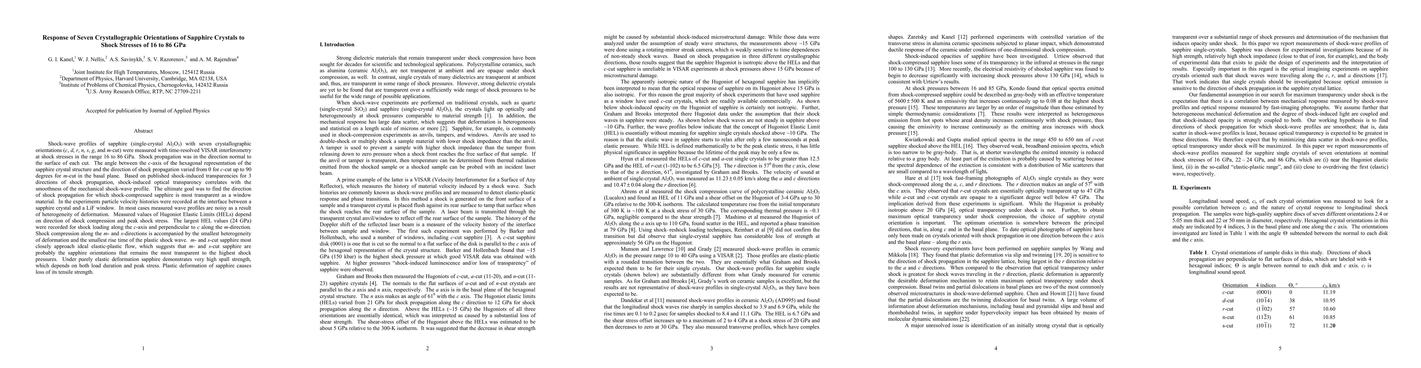 Shock-wave profiles of sapphire (single-crystal Al2O3) with seven crystallographic orientations were measured with time-resolved VISAR interferometry at shock stresses in the range 16 to 86 GPa. Shock propagation was normal to the surface of each cut. The angle between the c-axis of the hexagonal crystal structure and the direction of shock propagation varied from 0 for c-cut up to 90 degrees for m-cut in the basal plane. Based on published shock-induced transparencies, shock-induced optical transparency correlates with the smoothness of the shock-wave profile. The ultimate goal was to find the direction of shock propagation in sapphire that is most transparent as a window. Particle velocity histories were recorded at the interface between a sapphire crystal and a LiF window. In most cases measured wave profiles are noisy as a result of heterogeneity of deformation. Measured values of Hugoniot Elastic Limits (HELs) depend on direction of shock compression and peak shock stress. The largest HEL values were recorded for shock loading along the c-axis and perpendicular to c along the m-direction. Shock compression along the m- and s-directions is accompanied by the smallest heterogeneity of deformation and the smallest rise time of the plastic shock wave. m- and s-cut sapphire most closely approach ideal elastic-plastic flow, which suggests that m- and s-cut sapphire are probably the orientations that remains most transparent to highest shock pressures. Under purely elastic deformation sapphire has very high spall strength, which depends on load duration and peak stress. Plastic deformation of sapphire causes loss of its tensile strength.