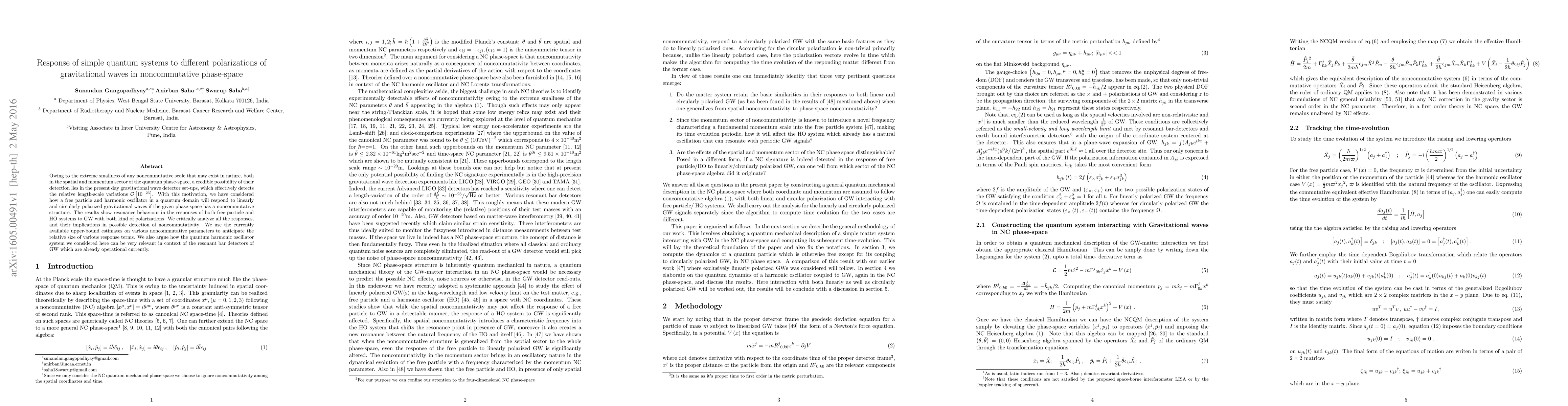This paper examines how simple quantum systems like free particles and harmonic oscillators respond to different polarizations of gravitational waves within a noncommutative phase-space framework. It finds resonance behavior in these systems' responses, offering implications for detecting noncommutativity through current gravitational wave detectors.