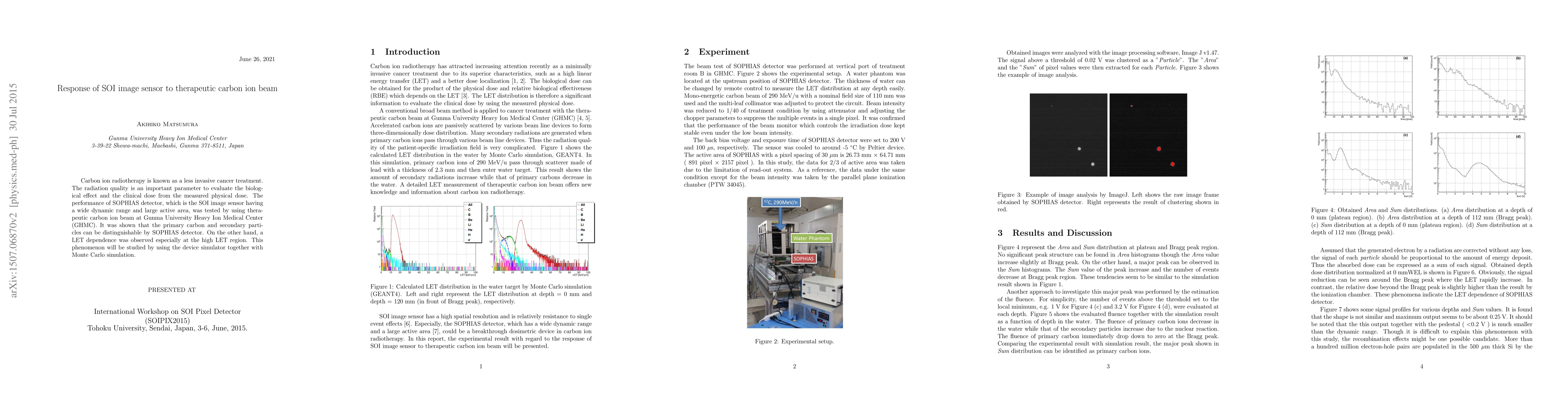 Carbon ion radiotherapy is known as a less invasive cancer treatment. The radiation quality is an important parameter to evaluate the biological effect and the clinical dose from the measured physical dose. The performance of SOPHIAS detector, which is the SOI image sensor having a wide dynamic range and large active area, was tested by using therapeutic carbon ion beam at Gunma University Heavy Ion Medical Center (GHMC). It was shown that the primary carbon and secondary particles can be distinguishable by SOPHIAS detector. On the other hand, a LET dependence was observed especially at the high LET region. This phenomenon will be studied by using the device simulator together with Monte Carlo simulation.