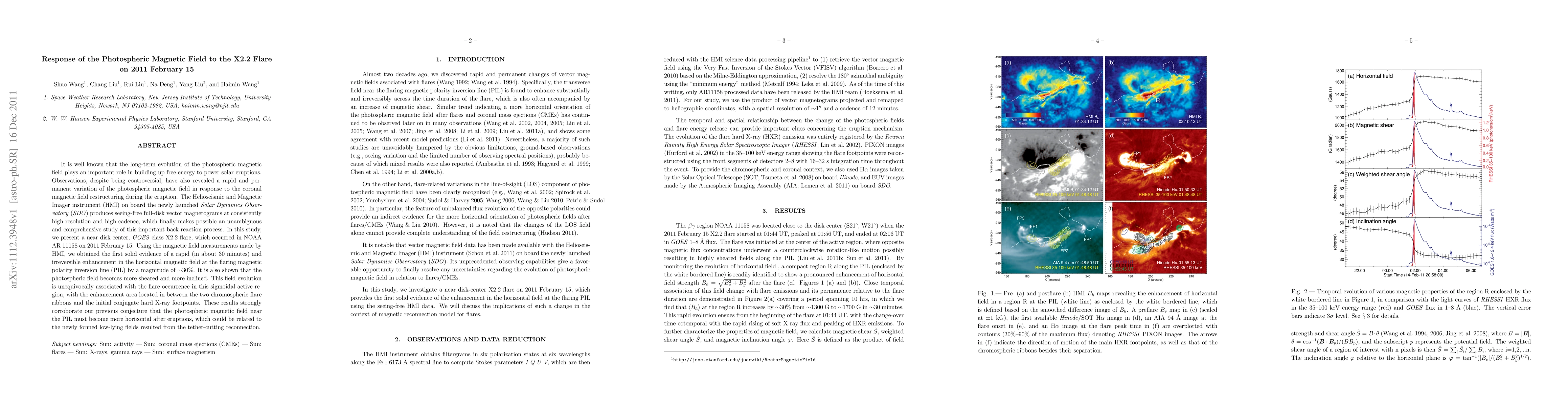 This study investigates the rapid and permanent changes in the photospheric magnetic field following the X2.2 flare on February 15, 2011, using data from the HMI on the SDO. It reveals a significant (~30%) enhancement in the horizontal magnetic field at the polarity inversion line, indicating a more sheared and inclined field, corroborating the hypothesis of post-flare horizontal field evolution due to reconnection.