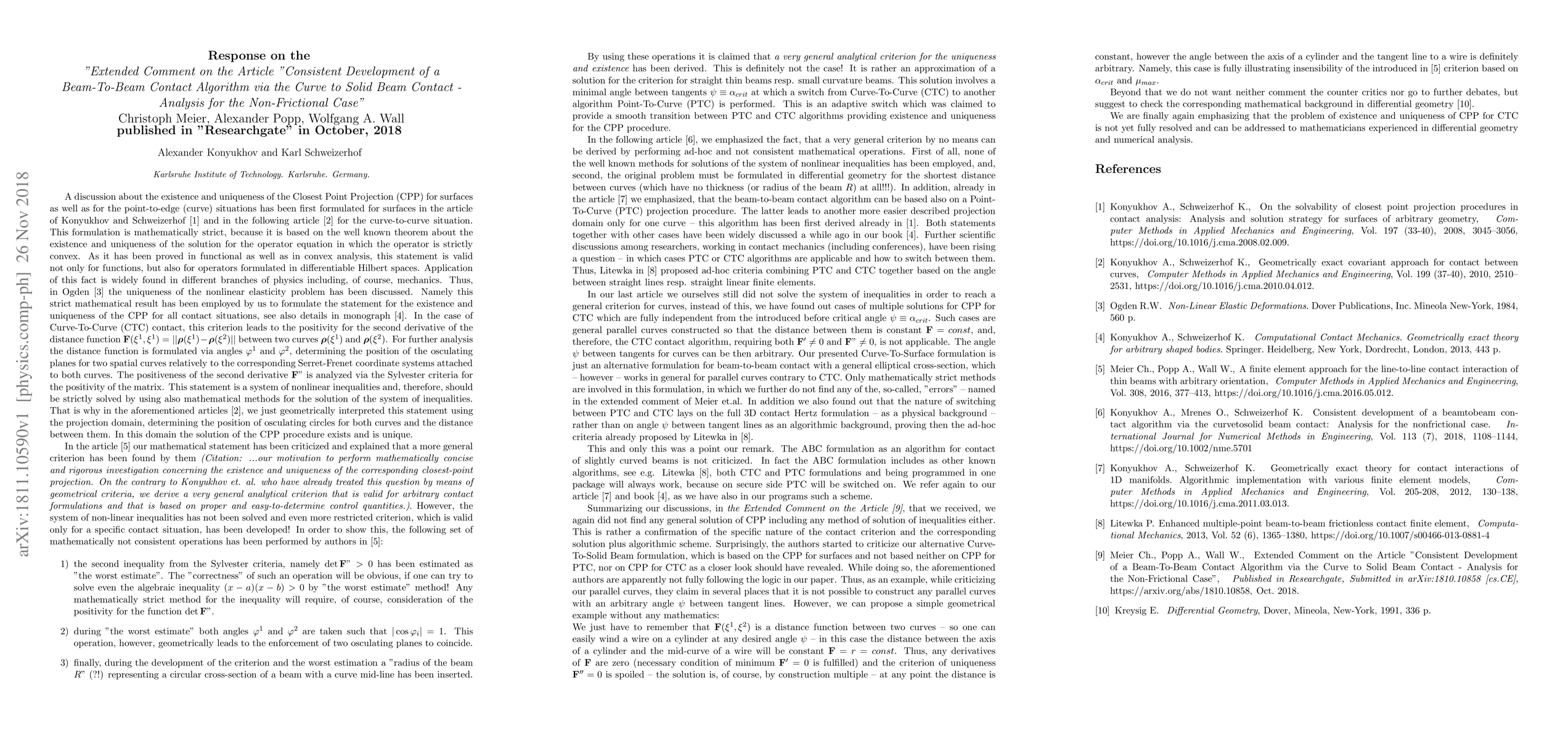 Summarizing our discussions, in the Extended Comment on the Article, that we received, we again did not find any general solution of CPP including any method of solution of inequalities either. This is rather a confirmation of the specific nature of the contact criterion and the corresponding solution plus algorithmic scheme. Surprisingly, the authors started to criticize our alternative Curve-To-Solid Beam formulation, which is based on the CPP for surfaces and not based neither on CPP for PTC, nor on CPP for CTC as a closer look should have revealed. While doing so, the aforementioned authors are apparently not fully following the logic in our paper. Thus, as an example, while criticizing our parallel curves, they claim in several places that it is not possible to construct any parallel curves with an arbitrary angle between tangent lines. However, one can easily wind a wire on a cylinder at any desired angle -- in this case the distance between the axis of a cylinder and the mid-curve of a wire will be constant -- solution is, of course, multiple excluding application of CTC algorithm. We are emphasizing in detail again the fact, that a very general criterion for the existence and uniqueness of the CPP procedure for Curve-To-Curve algorithm by no means can be derived by performing ad-hoc and not consistent mathematical operations.