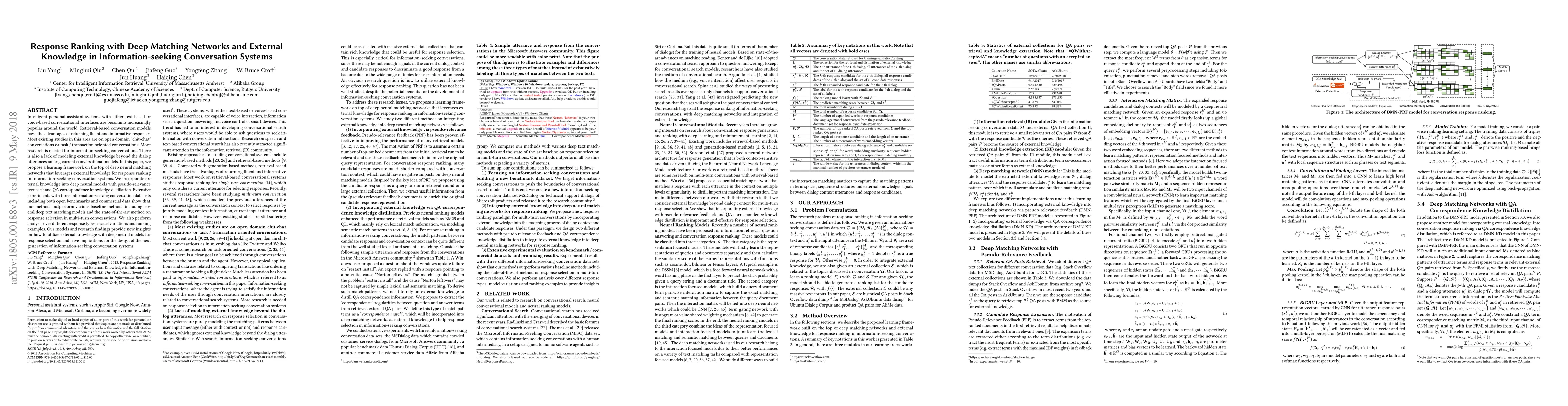 This paper proposes a deep neural matching network framework that leverages external knowledge for response ranking in information-seeking conversation systems, outperforming baseline methods in experiments. The approach incorporates external knowledge through pseudo-relevance feedback and QA correspondence knowledge distillation, providing insights for next-generation conversational systems.