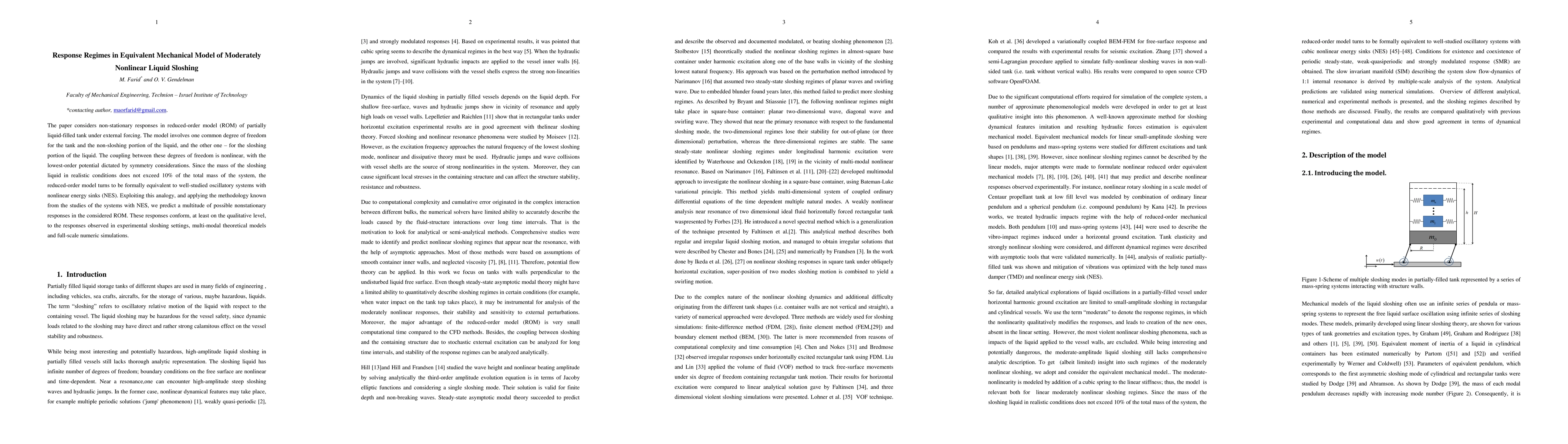The paper considers non-stationary responses in reduced-order model of partially liquid-filled tank under external forcing. The model involves one common degree of freedom for the tank and the non-sloshing portion of the liquid, and the other one -- for the sloshing portion of the liquid. The coupling between these degrees of freedom is nonlinear, with the lowest-order potential dictated by symmetry considerations. Since the mass of the sloshing liquid in realistic conditions does not exceed 10% of the total mass of the system, the reduced-order model turns to be formally equivalent to well-studied oscillatory systems with nonlinear energy sinks (NES). Exploiting this analogy, and applying the methodology known from the studies of the systems with the NES, we predict a multitude of possible non-stationary responses in the considered model. These responses conform, at least on the qualitative level, to the responses observed in experimental sloshing settings, multi-modal theoretical models and full-scale numeric simulations.