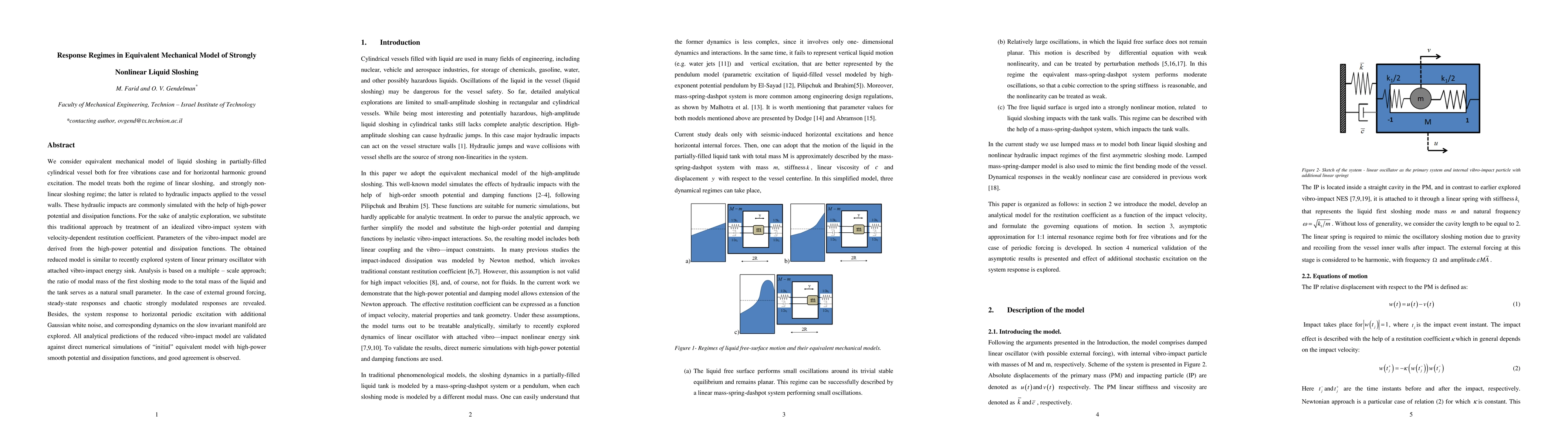 This paper investigates an equivalent mechanical model for liquid sloshing in a partially-filled cylindrical vessel, exploring both linear and strongly nonlinear regimes, particularly focusing on hydraulic impacts. An idealized vibro-impact system with a velocity-dependent restitution coefficient is used for analytical exploration, validated against numerical simulations.