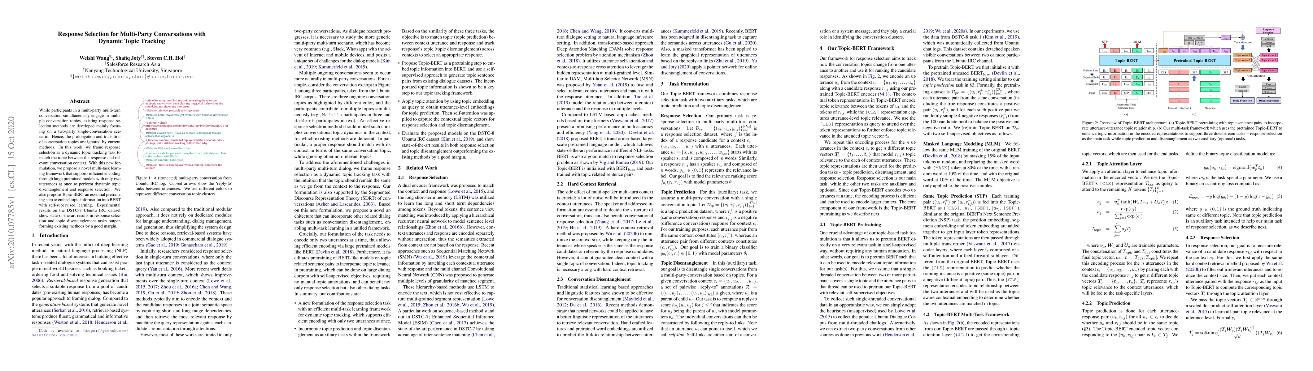 This paper proposes a novel multi-task learning framework for response selection in multi-party conversations with dynamic topic tracking, addressing the limitations of existing methods that focus on single-topic, two-party interactions. The framework employs Topic-BERT for embedding topic information into BERT, achieving state-of-the-art results in response selection and topic disentanglement on the DSTC-8 dataset.