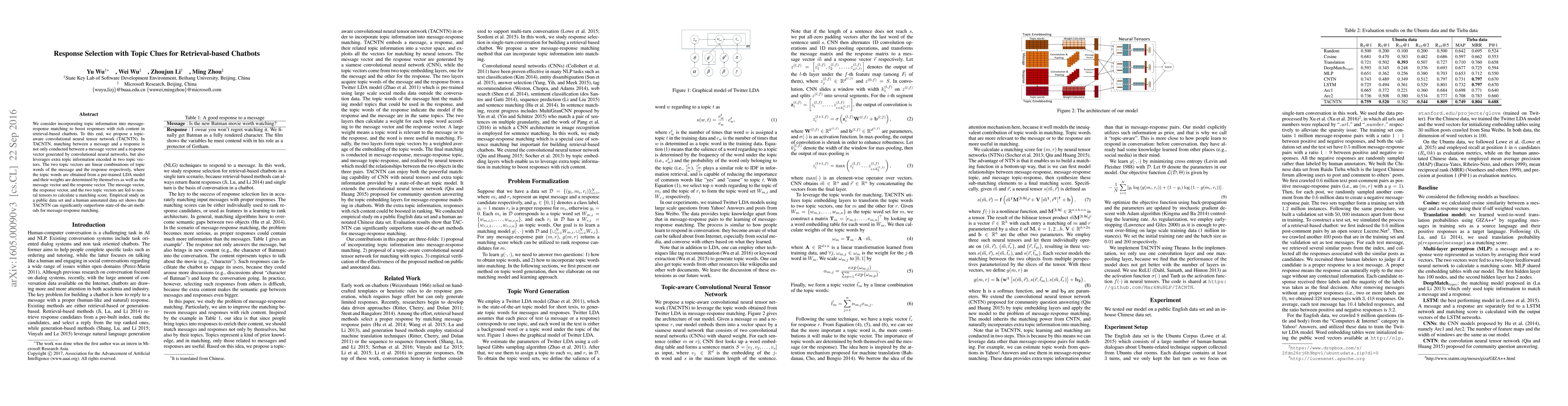 This paper proposes a topic-aware convolutional neural tensor network (TACNTN) to enhance retrieval-based chatbots by incorporating topic information into message-response matching. TACNTN significantly outperforms existing methods, as demonstrated by empirical studies on public and human-annotated datasets.