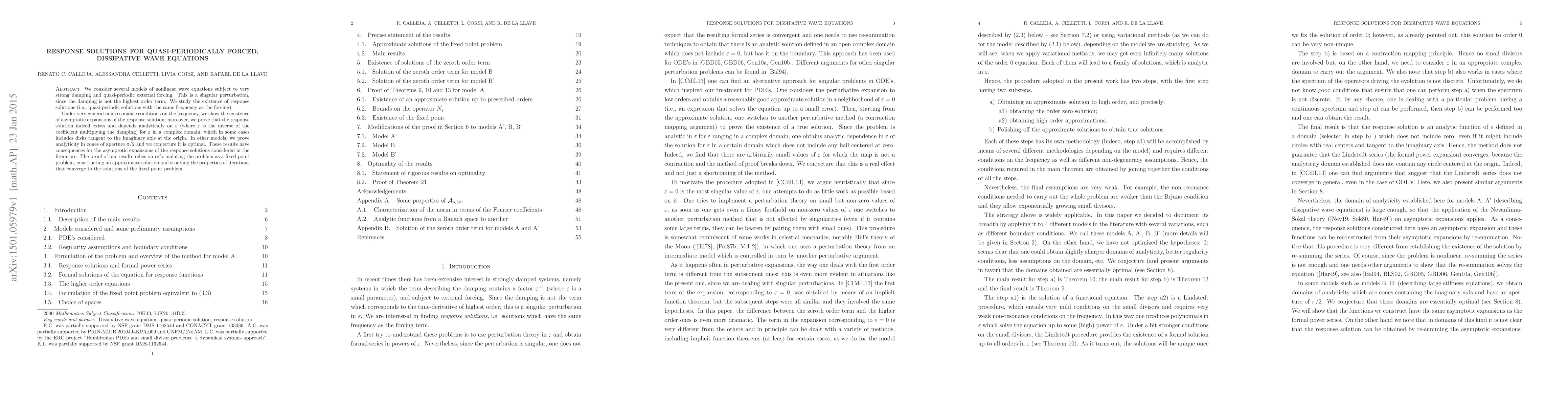 This paper investigates nonlinear wave equations with strong damping and quasi-periodic forcing, proving the existence of response solutions that match the frequency of the forcing. It demonstrates analyticity of these solutions in various complex domains, relying on reformulating the problem as a fixed point problem and constructing convergent iterations.