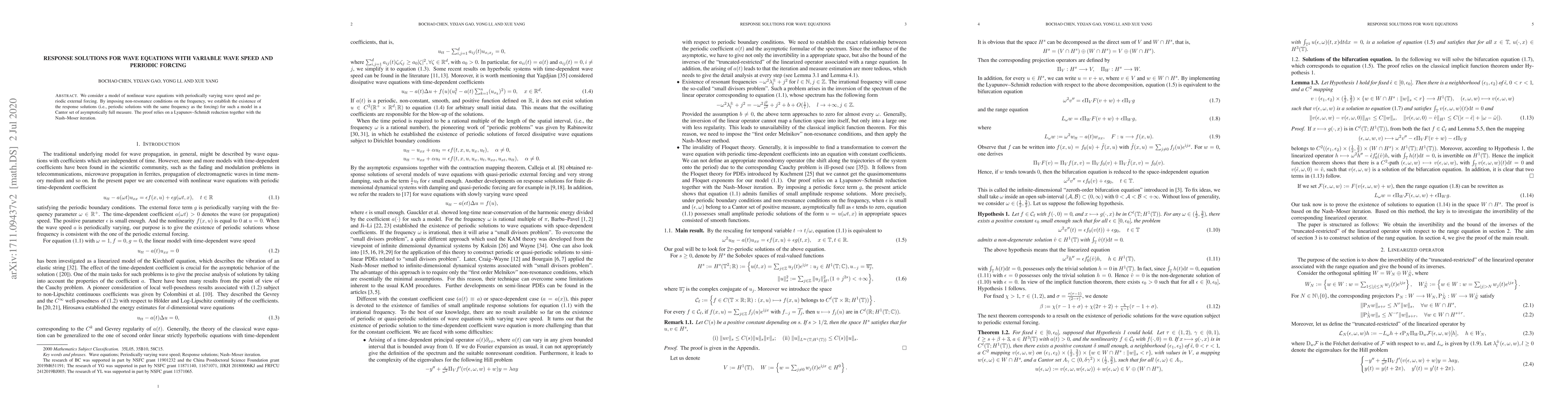 This paper establishes the existence of response solutions for nonlinear wave equations with periodically varying wave speed and periodic forcing, proving their existence in a Cantor set of asymptotically full measure using Lyapunov-Schmidt reduction and Nash-Moser iteration under non-resonance conditions.