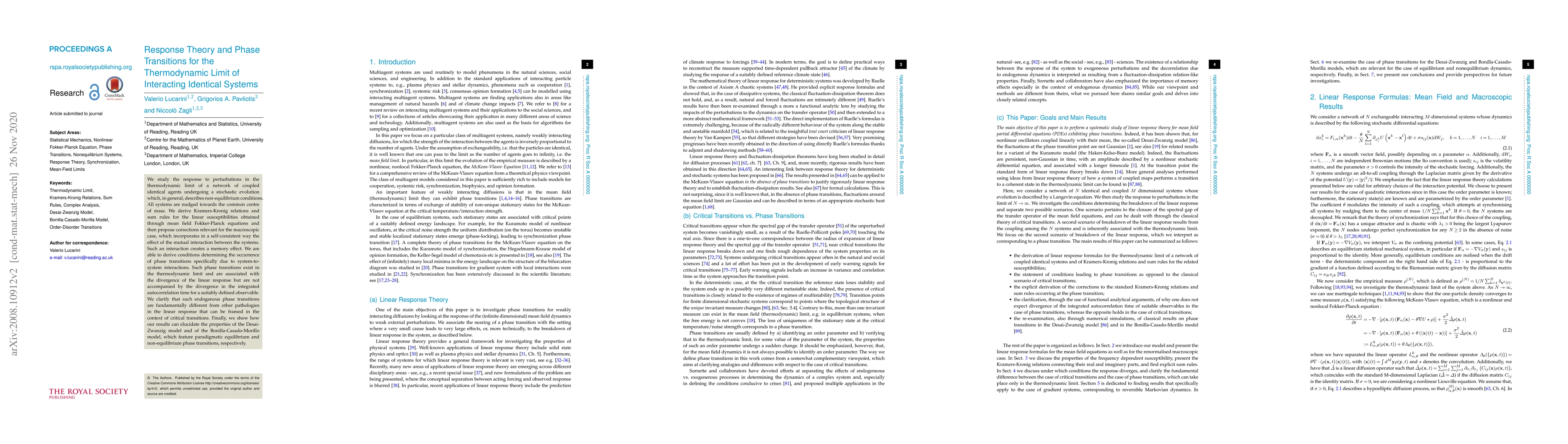 This paper investigates the response to perturbations in the thermodynamic limit of interacting identical systems, deriving Kramers-Kronig relations and sum rules for linear susceptibilities. It identifies phase transitions due to mutual interactions, distinct from critical transitions, and applies the findings to the Desai-Zwanzig and Bonilla-Casado-Morillo models.