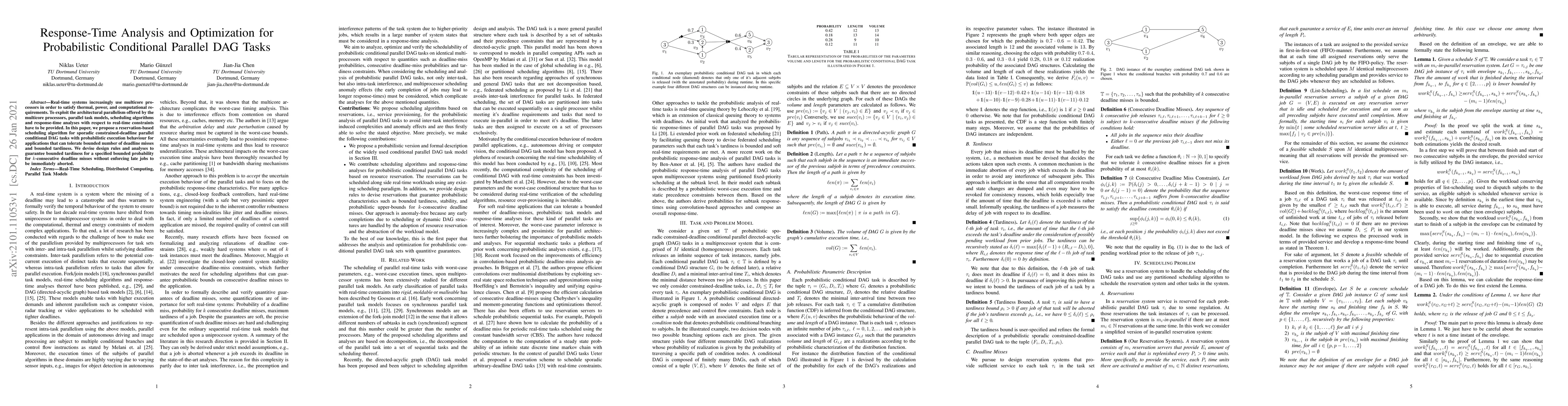 This paper proposes a reservation-based scheduling algorithm for parallel conditional DAG tasks with probabilistic execution, aiming to optimize response times while ensuring bounded tardiness and a specified probability of consecutive deadline misses. The approach allows for a bounded number of deadline misses and tardiness without aborting late jobs.