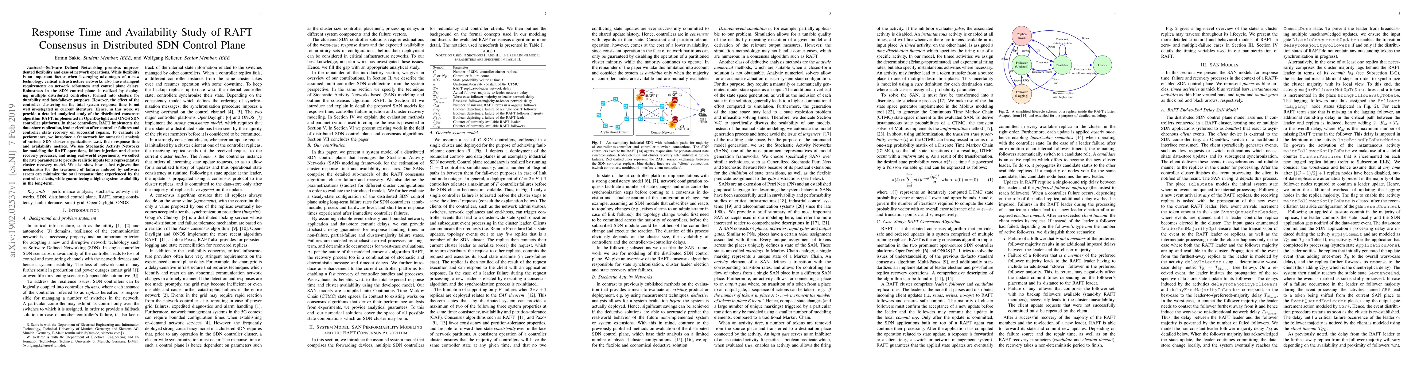 This paper conducts an analytical study on the RAFT consensus algorithm in distributed SDN control planes, focusing on response time and availability. It introduces a framework for evaluating various cluster organizations and uses Stochastic Activity Networks to model RAFT operations, demonstrating how a fast rejuvenation mechanism can minimize response time while enhancing long-term system availability.