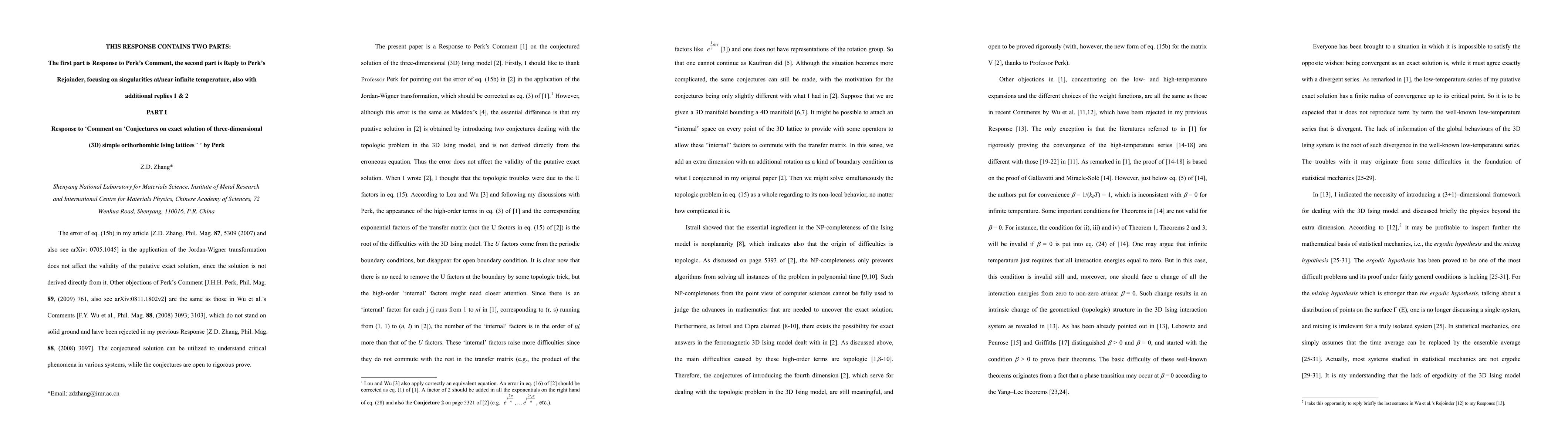 Part I: The error of eq. (15b) in my article [Z.D. Zhang, Phil. Mag. 87, 5309 (2007), arXiv:0705.1045] in the application of the Jordan-Wigner transformation does not affect the validity of the putative exact solution, since the solution is not derived directly from it. Other objections of Perk's Comment arXiv:0811.1802v2 are the same as those in Wu et al's Comments arXiv:0811.3876 and arXiv:0812.2837, which do not stand on solid ground and have been rejected in the previous Response arXiv:0812.2330. The conjectured solution can be utilized to understand critical phenomena in various systems, while the conjectures are open to prove rigorously. Part II: This is a Reply to Perk's Rejoinder arXiv:0901.2935. It is shown that the basis of the objections in Perk's Rejoinder, with respect to singularities at/near infinite temperature, is based on an error that mixes the concepts of T approaching infinite and T = infinite. It is shown that the reduced free energy per site f can be used only for finite temperatures (beta > 0), not for 'exactly' infinite temperature (beta = 0). At the thermodynamic limit N approaches infinite, besides infinite-temperature zeros of Z at z = -1 for H = +/- i infinite in the limit of beta approaching zero, there exists another singularity at z = 1 for the partition function, which is usually concealed in literature by setting Z to the power of 1/N and dividing the total free energy F by N (equally, disregarding the singularity of zeros of 1/Z. The objections in Perk's Rejoinder are thoroughly disproved.