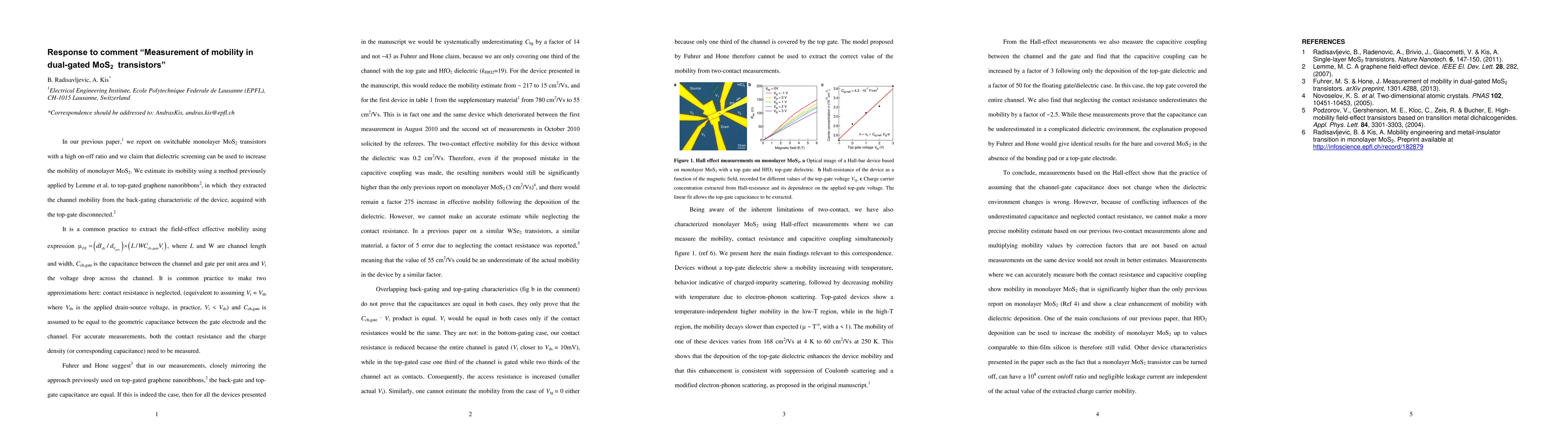 This paper addresses comments on the authors' previous report on high-mobility monolayer MoS2 transistors, clarifying potential errors in their initial mobility measurements and discussing the impact of dielectric screening. The authors respond to critiques from M. Fuhrer and J. Hone, providing new estimates of measurement inaccuracies.